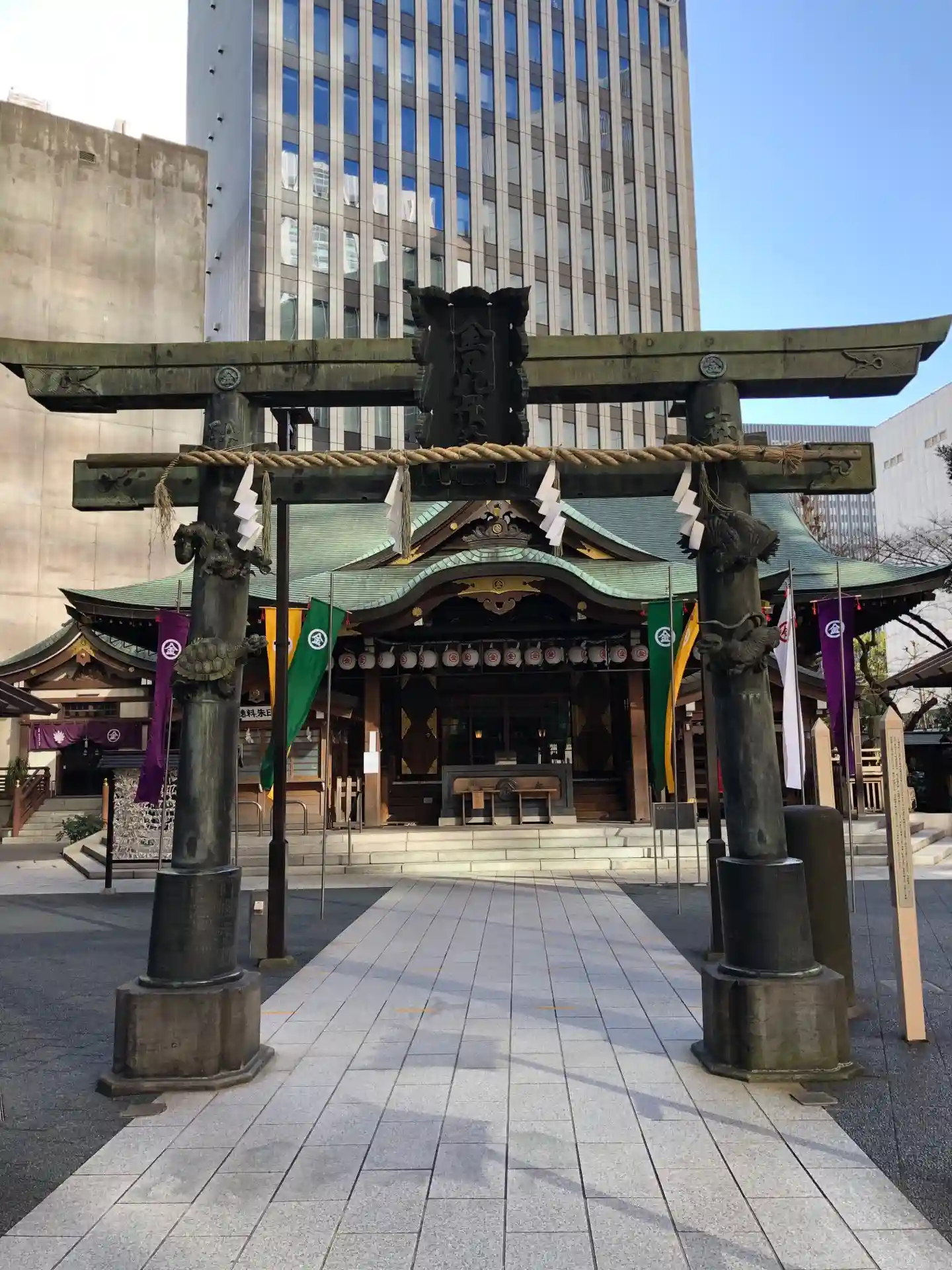 オフィスタワーの敷地内に鎮座しています。注目は拝殿前の鳥居。江戸時代から残る銅鳥居で四獣(四方を守護する霊鳥霊獣)の彫像が施されています。