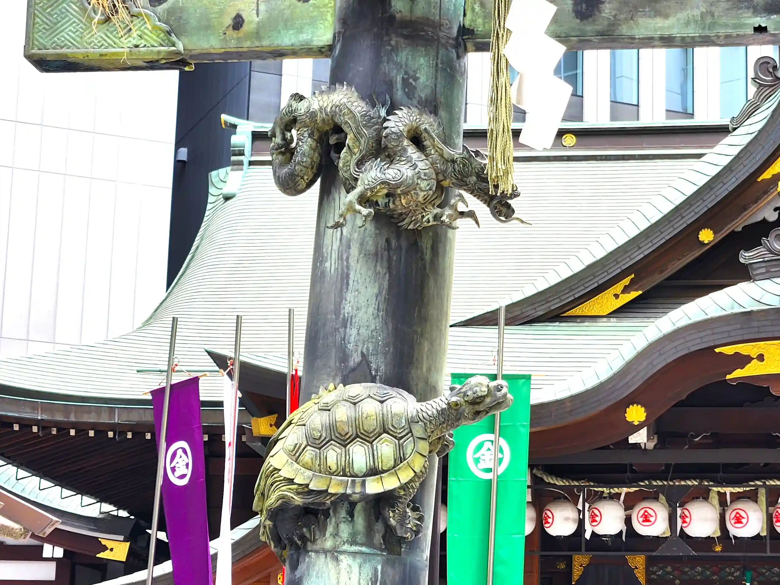 拝殿前には銅鳥居があるのですが、左右の柱には四神の彫刻があり魅了されてしまいました。