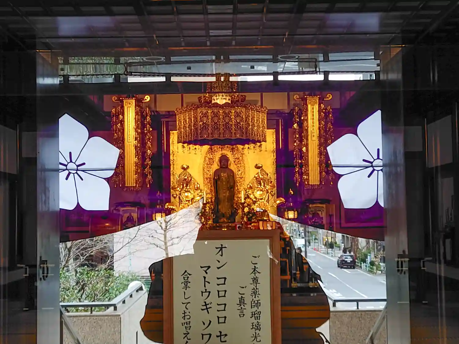 本日参拝後、二階本堂扉外から撮った、真福寺のお薬師さま。智山派の桔梗の宗紋がガラスに写って良い感じです!