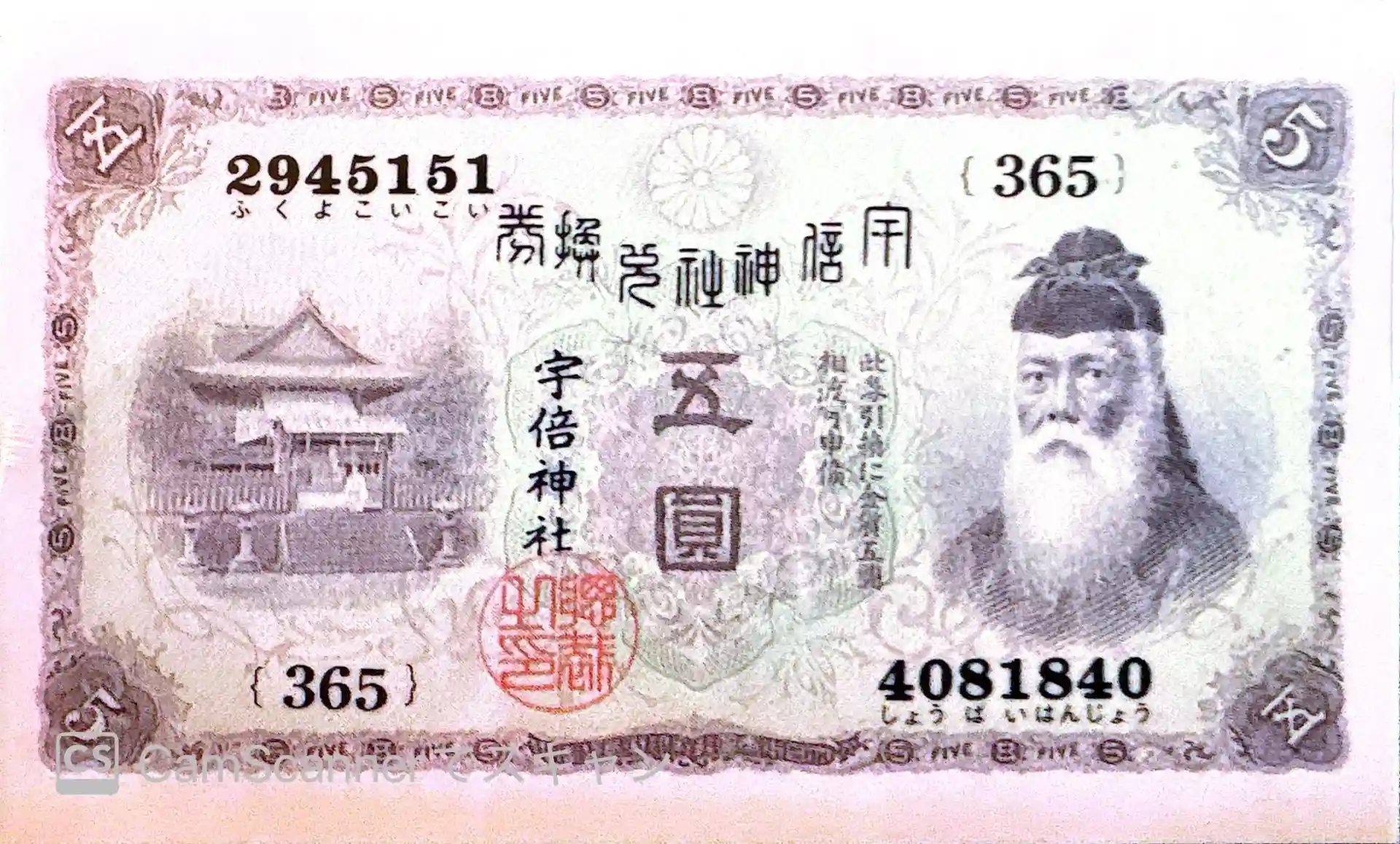 安倍神社〜お守りの反対側に旧紙幣を模している 左側が宇倍神社の拝殿