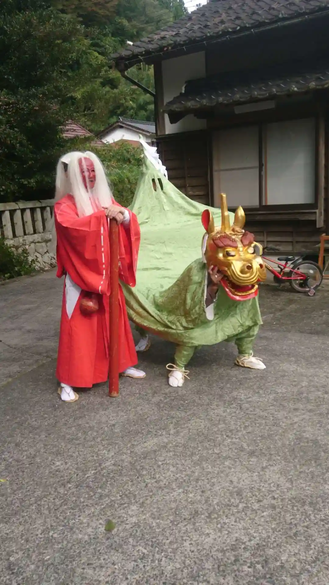これがウワサの麒麟獅子。傍らの赤装束の人物は「猩々(しょうじょう)」と呼ばれるあやし役だそうです。ちなみに我々、お宮を目指し歩いていると荷台に赤装束を乗っけた軽トラに追い抜かされました😞