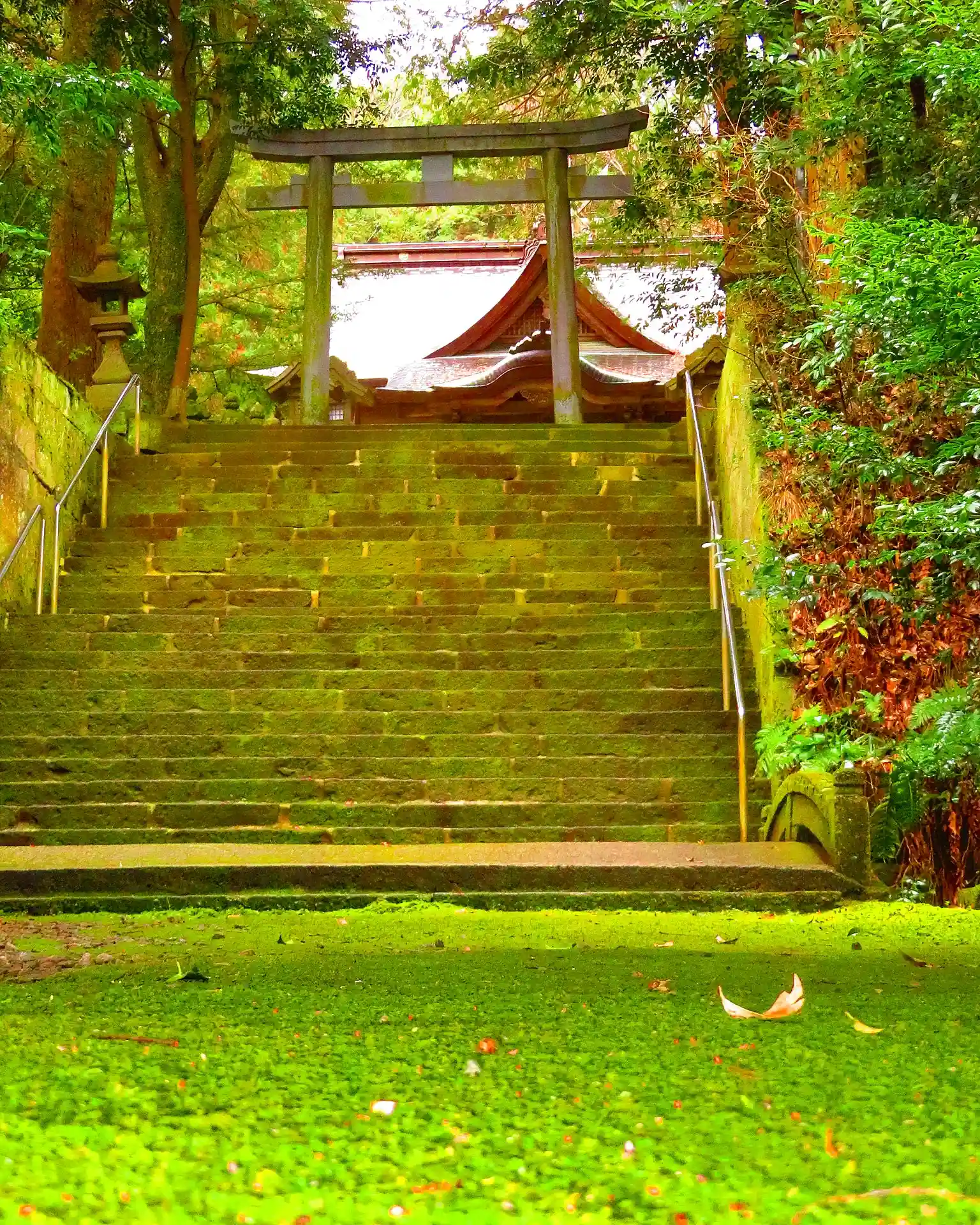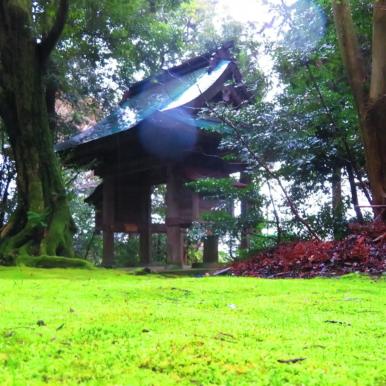 線路をまたぎ随神門を潜った瞬間から世界観が変わります、木々に囲まれ苔が張りめぐられた境内は緑色の世界でジブリ感を味わえるようなそんな場所です。