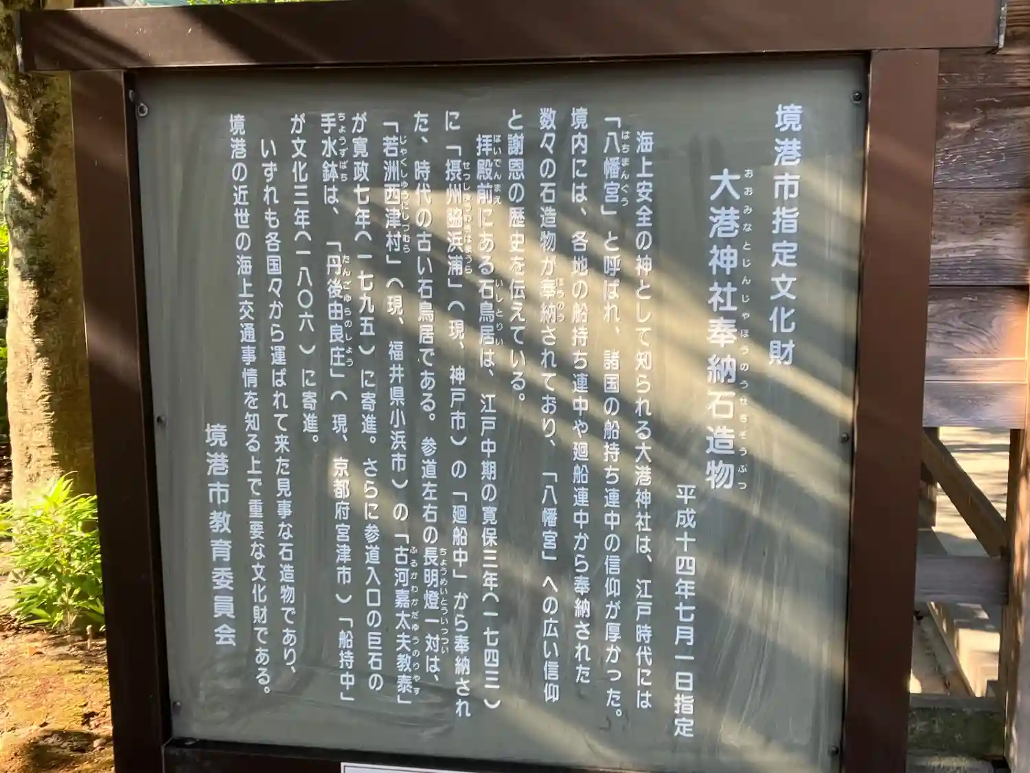 神社内の境港市指定文化財の説明書きです。