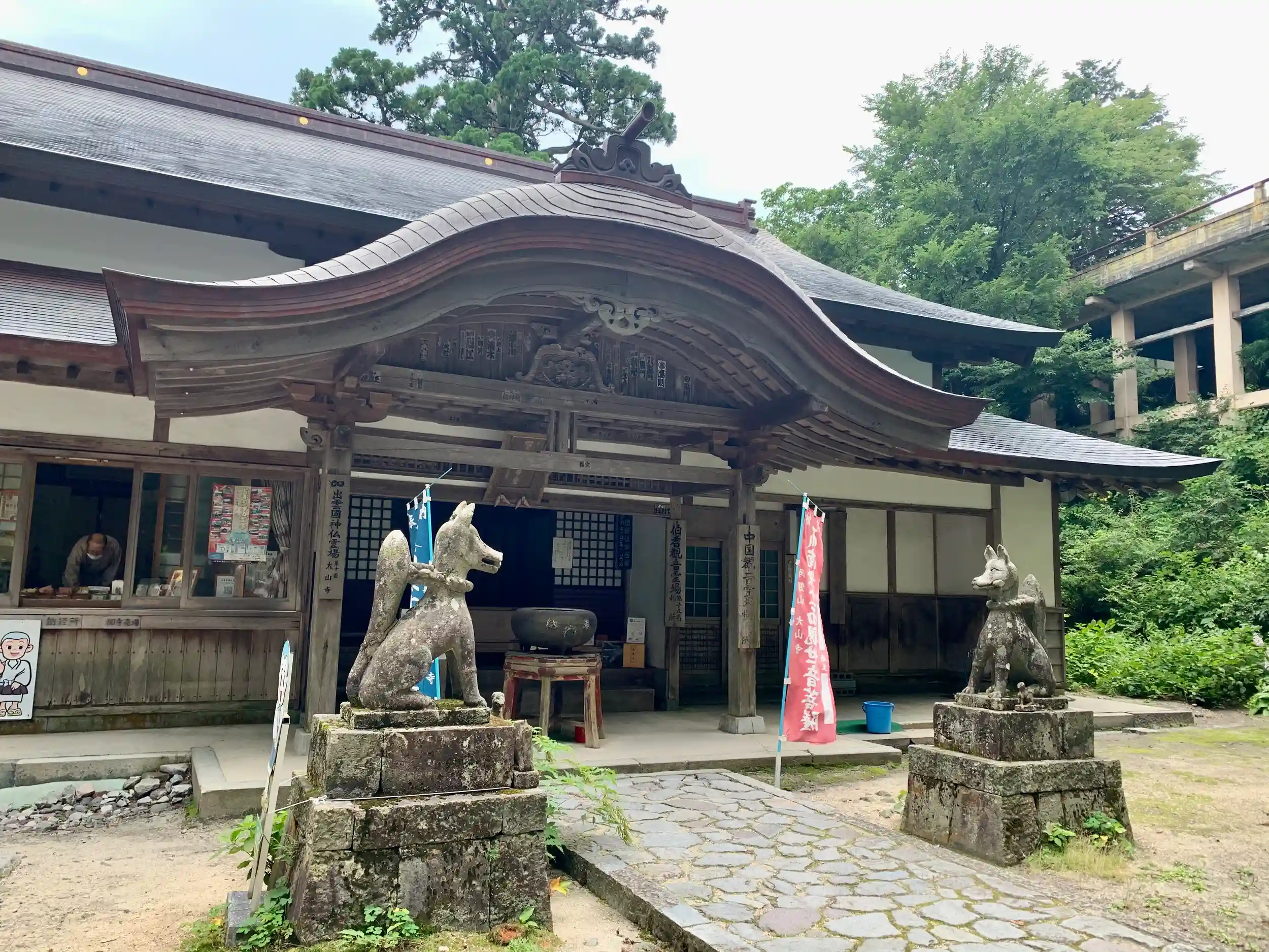 大山の中腹にあるので景色が良かったら本堂の後ろぐらいに大山の山頂が見えたりするのかな〜と思うけど大概雲がかかって何も見えない気がする。
