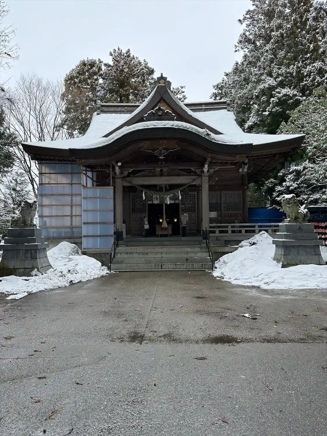 前日まで雪が積もっていたらしく、拝殿周りの雪除けがまだ少し取り付けられています。