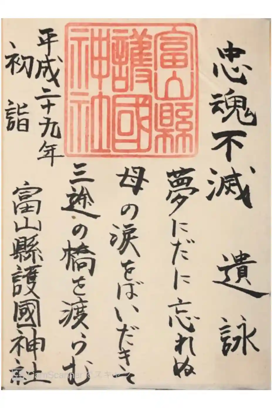 右上に忠魂不滅、下部に遺詠 夢にだに 忘れぬ母の 涙をば いだきて三途の 橋を渡らむ、富山縣護國神社と書かれ、真ん中上部に富山縣護國神社の社印が押されています。