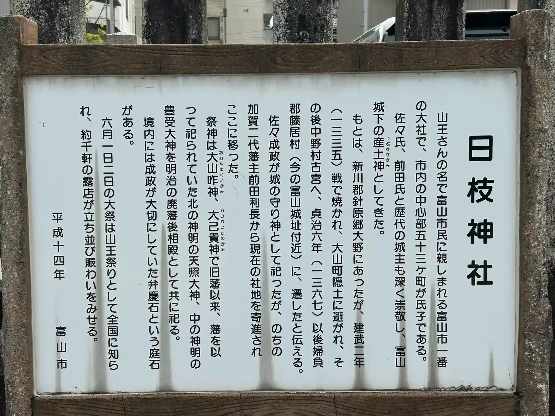 山王さんの名で富山市民に親しまれる富山市一番の大社で、市内の中心部五十三ヶ町が氏子であり、心のよりどころとして広く信仰されているそうです。