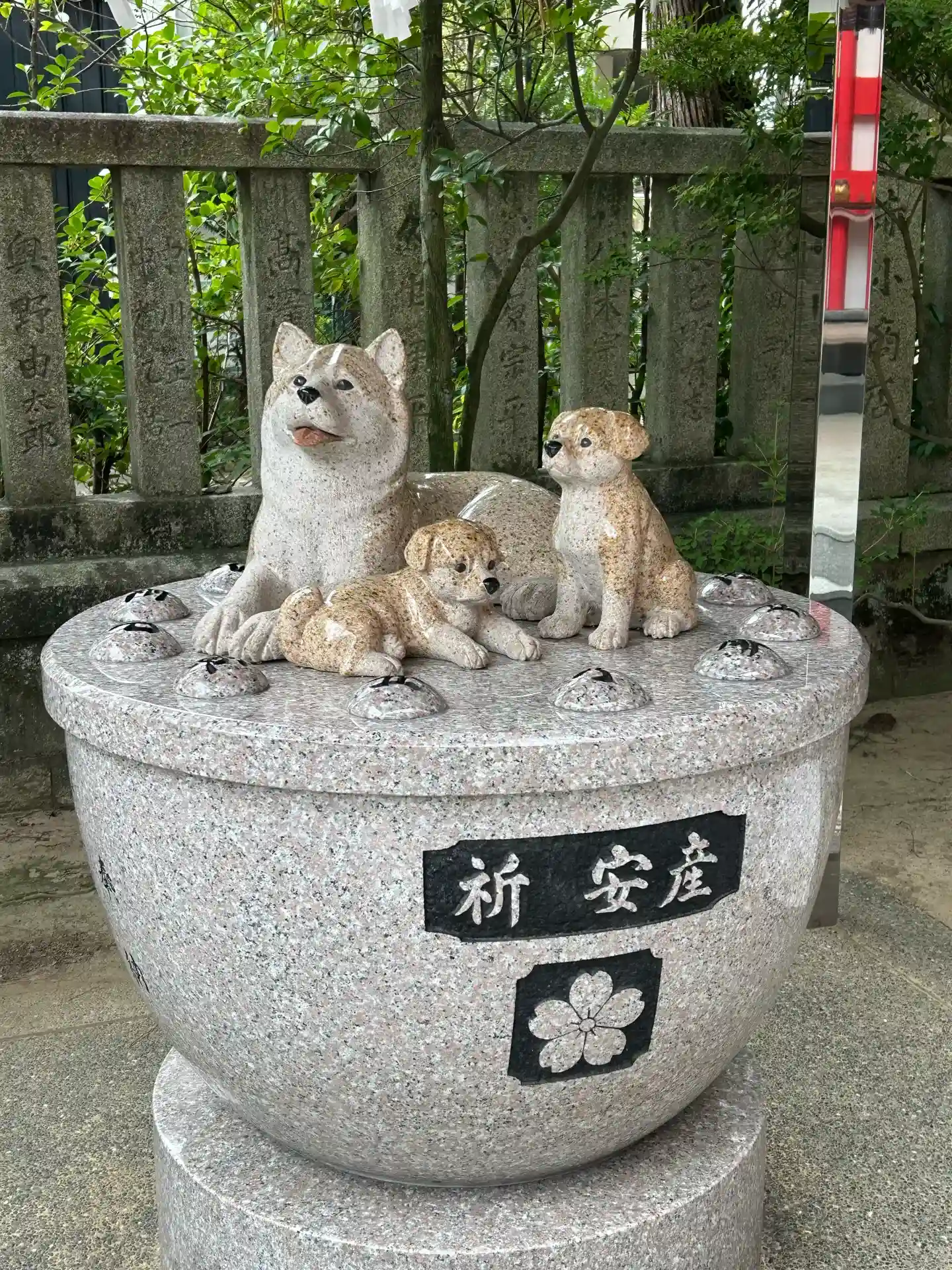 参道横に祈安産の犬石