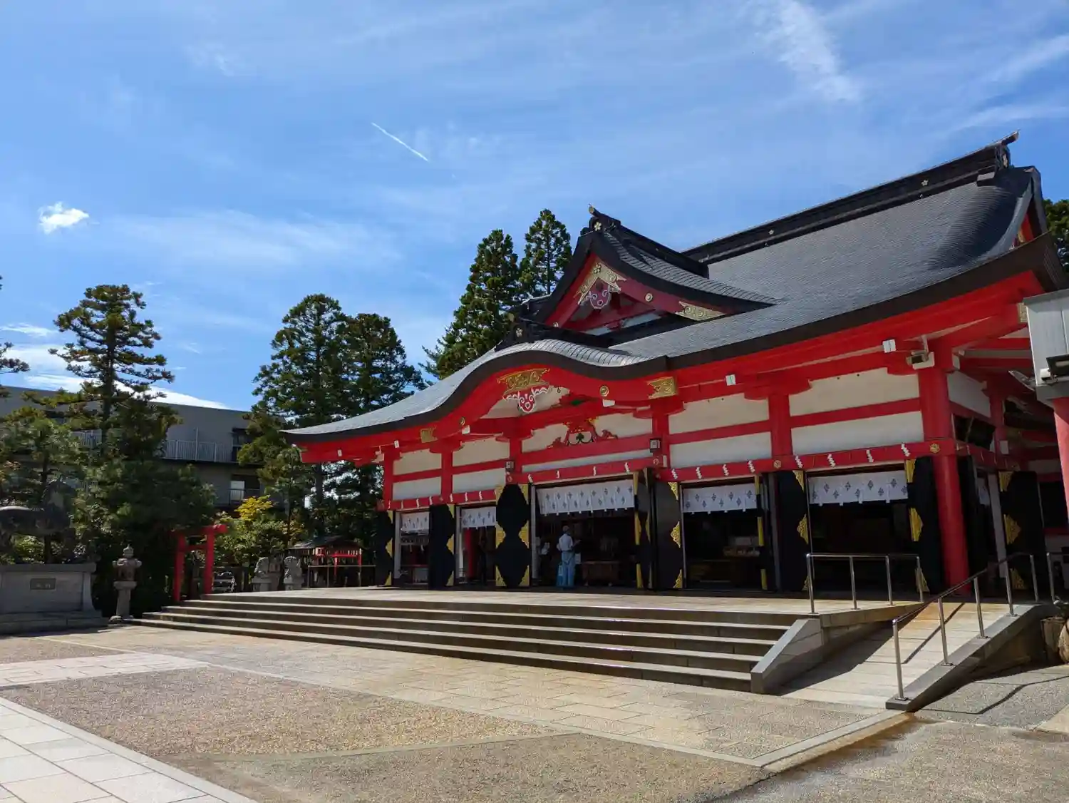 空の青に映える拝殿の朱色が美しいです。