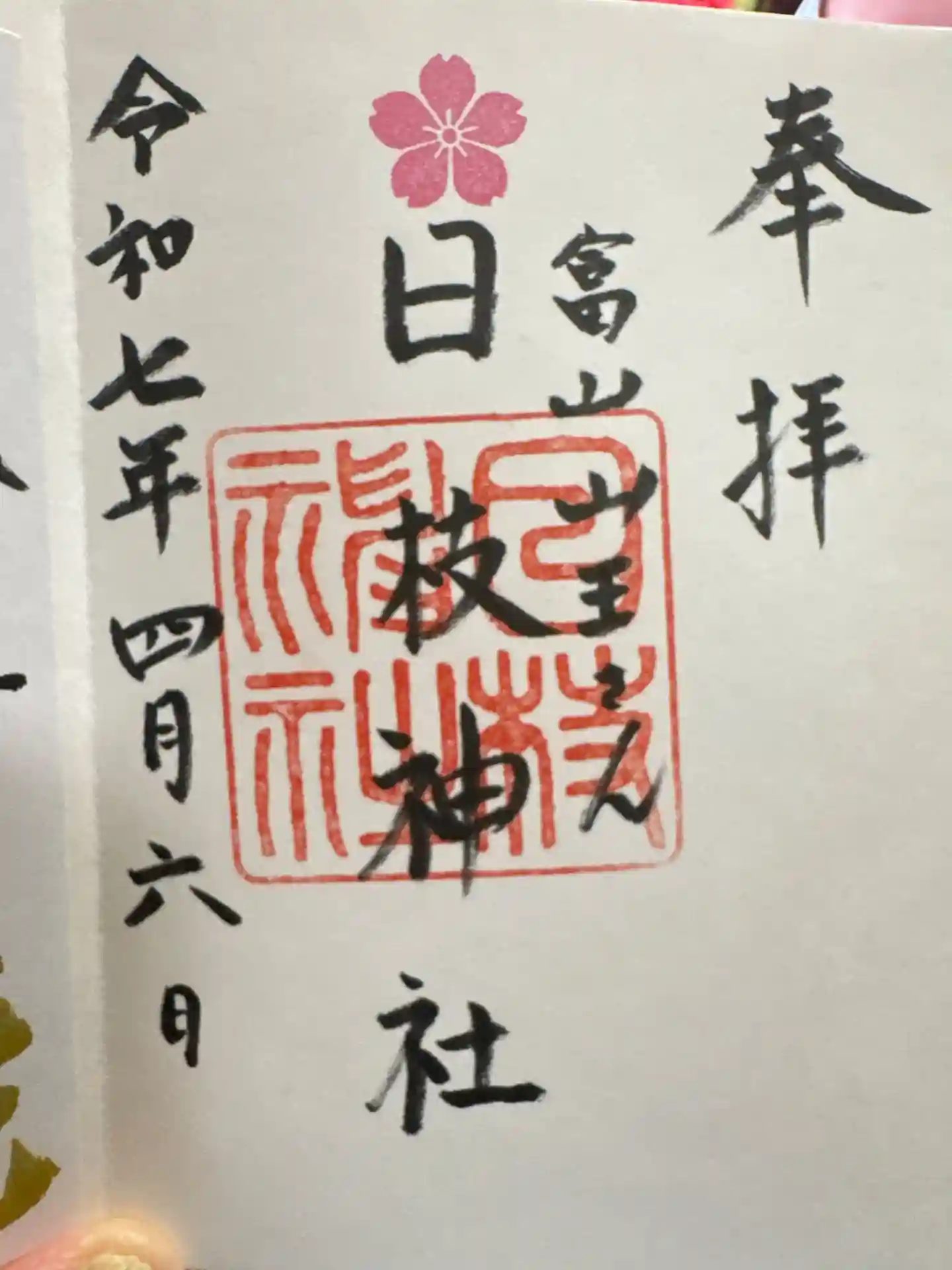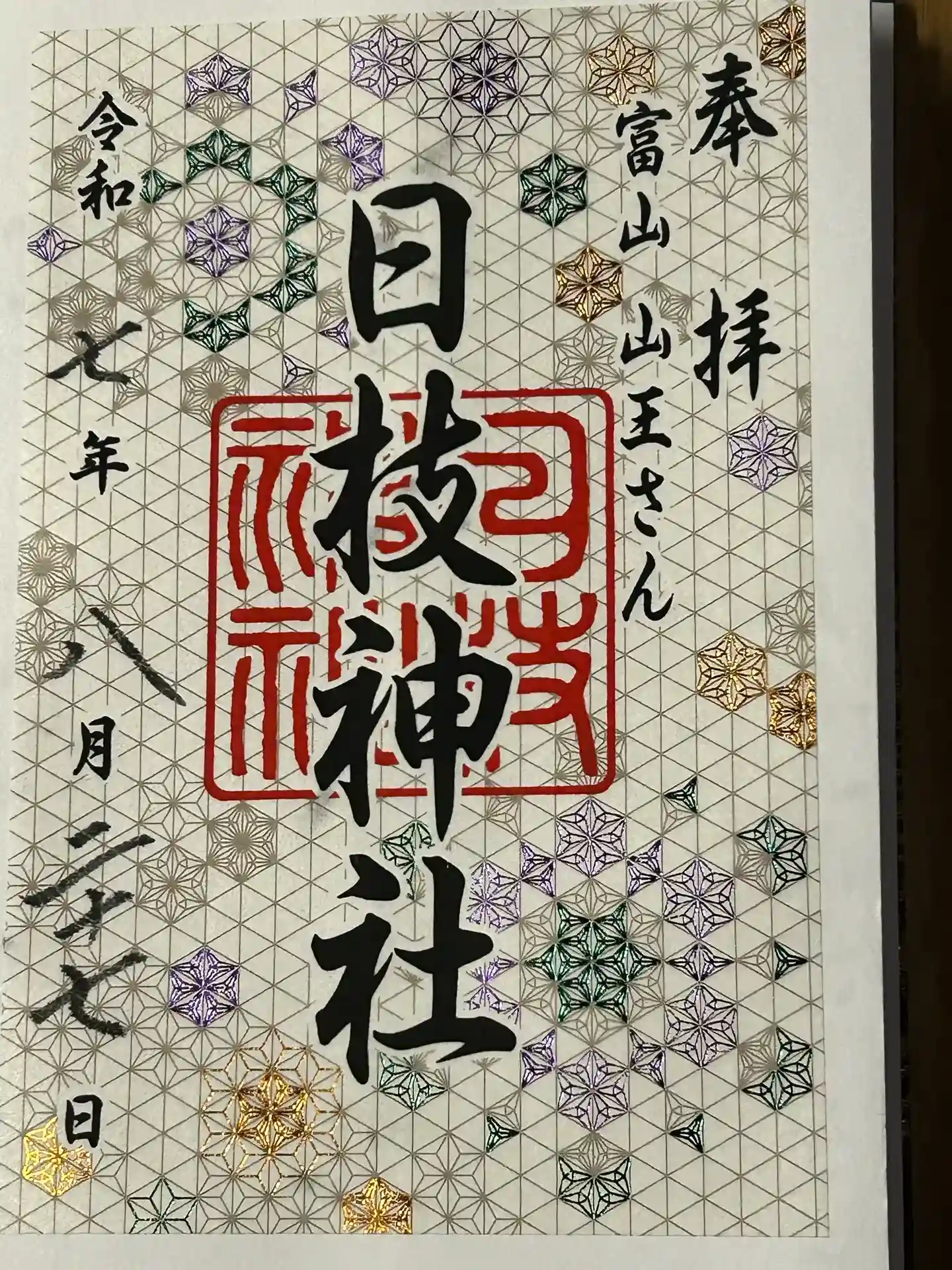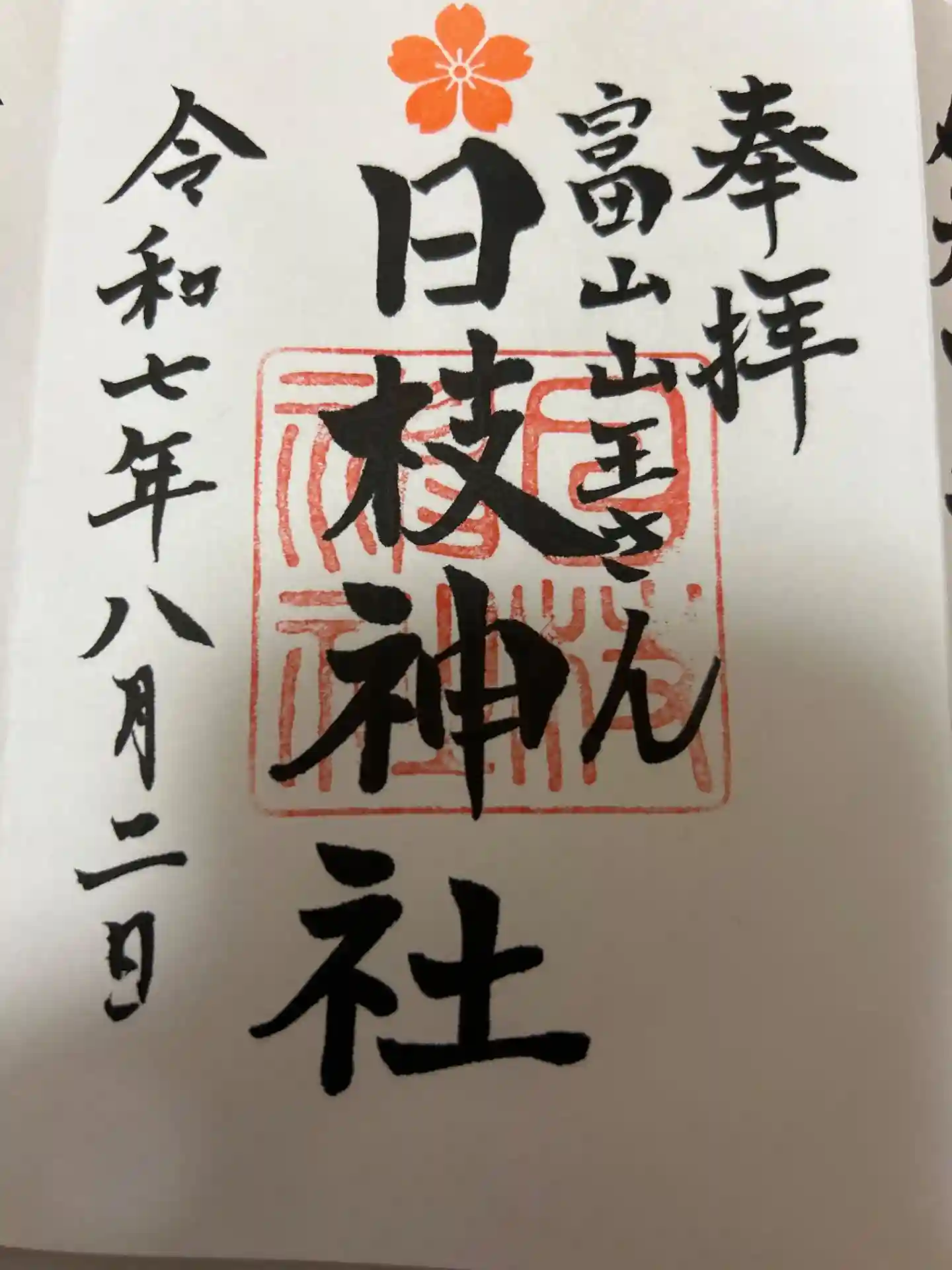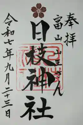 真ん中に日枝神社、その右に富山山王さんと書かれ、真ん中に桜紋の印、日枝神社の社印が押された御朱印です。 | |||