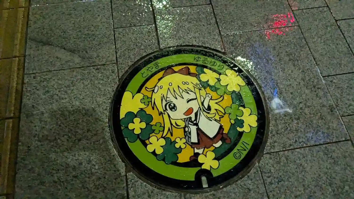 富山駅前に高岡市が舞台のアニメ「ゆるゆり」のマンホールがありました