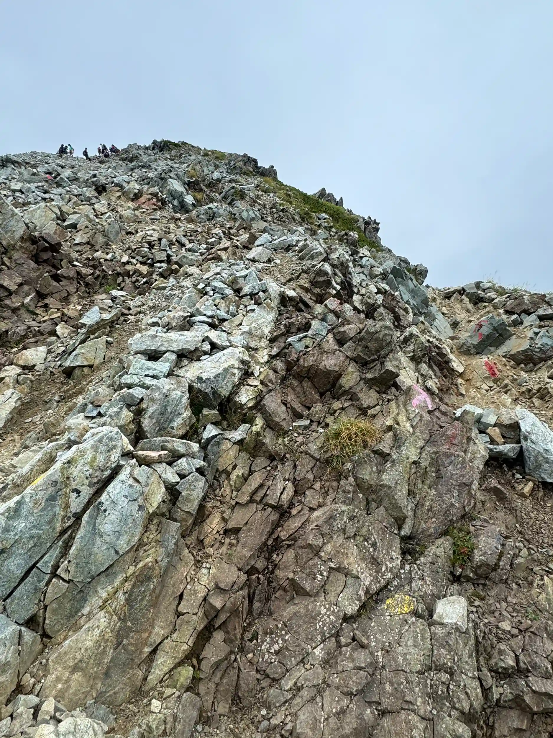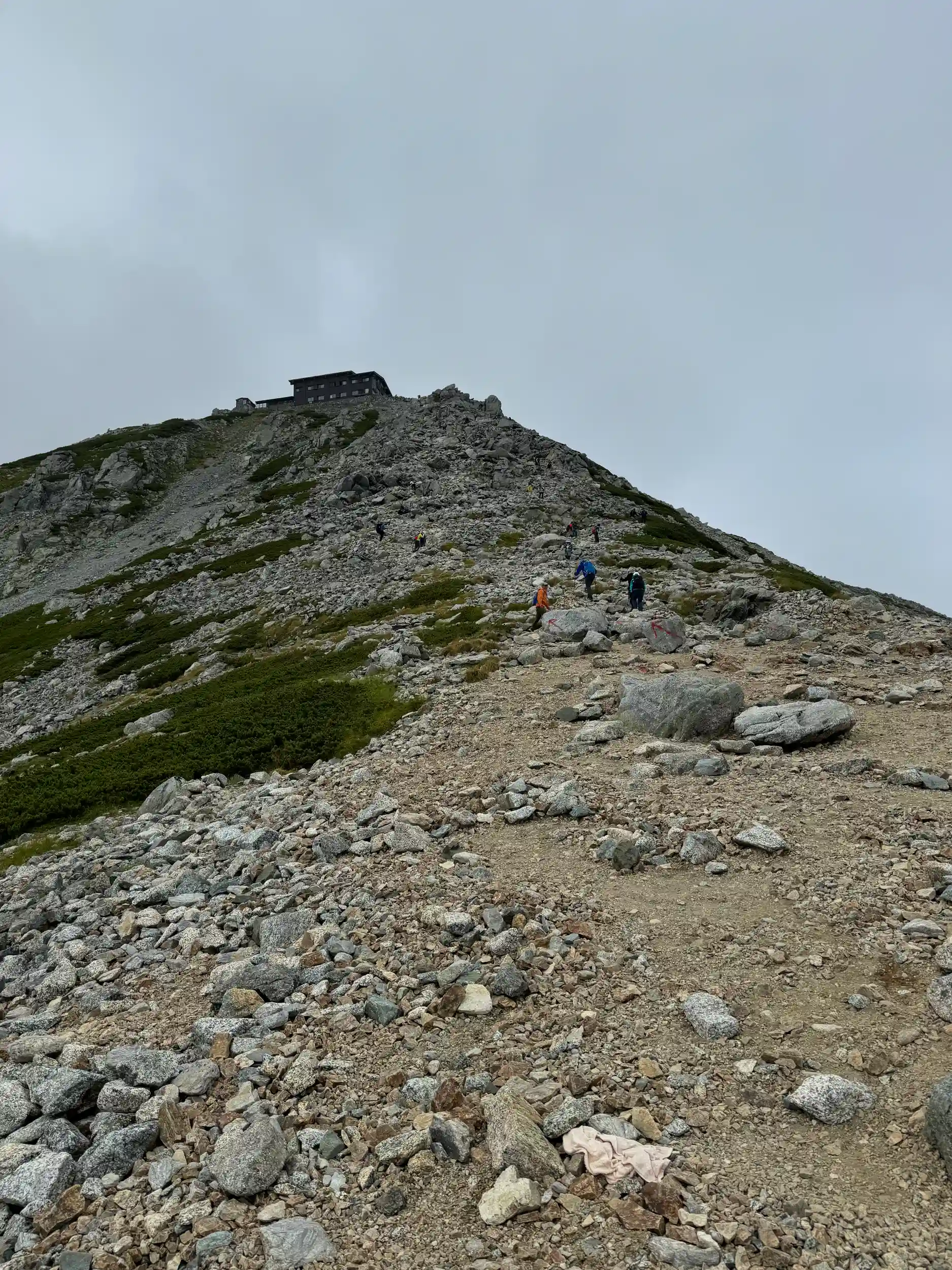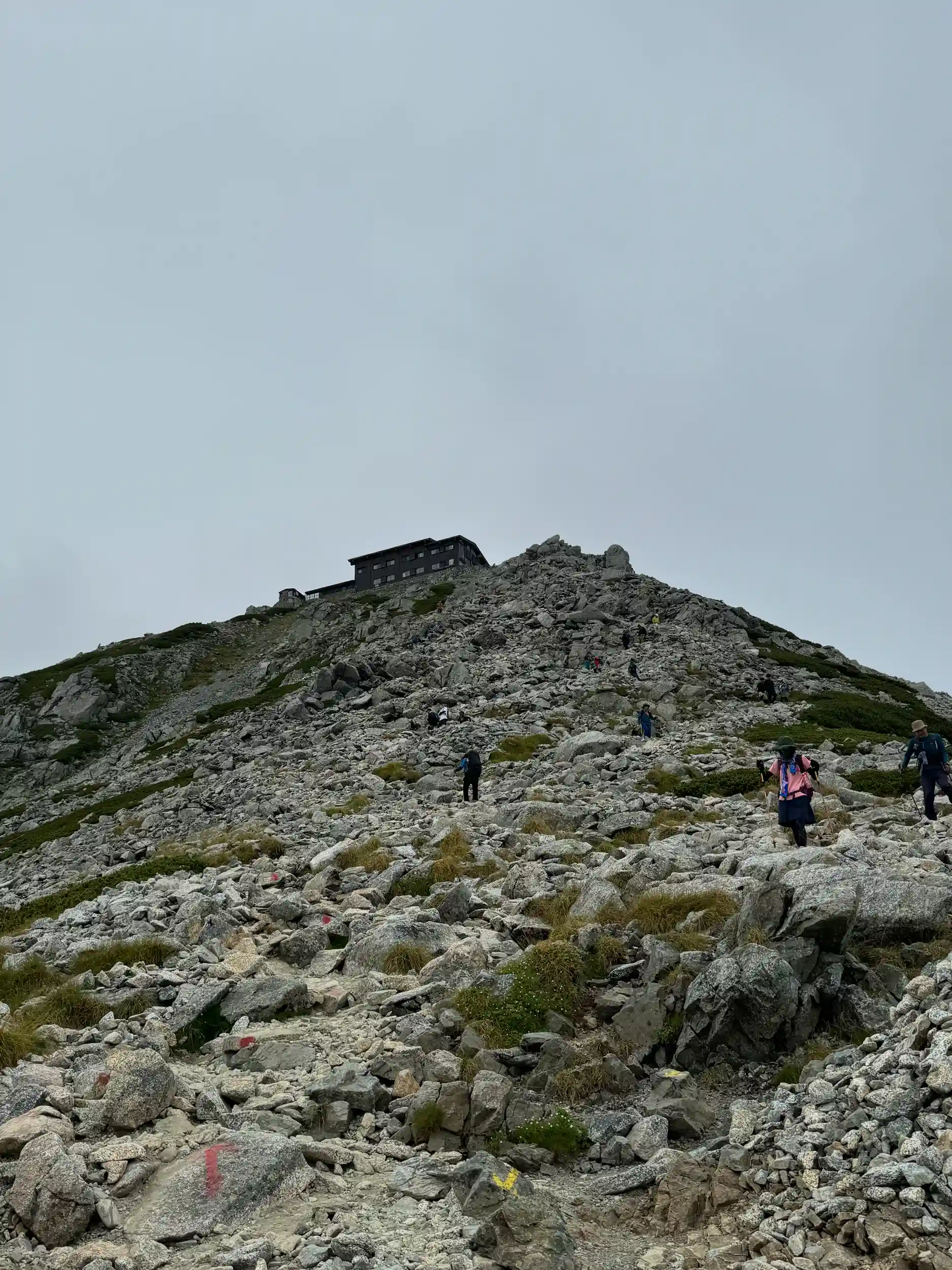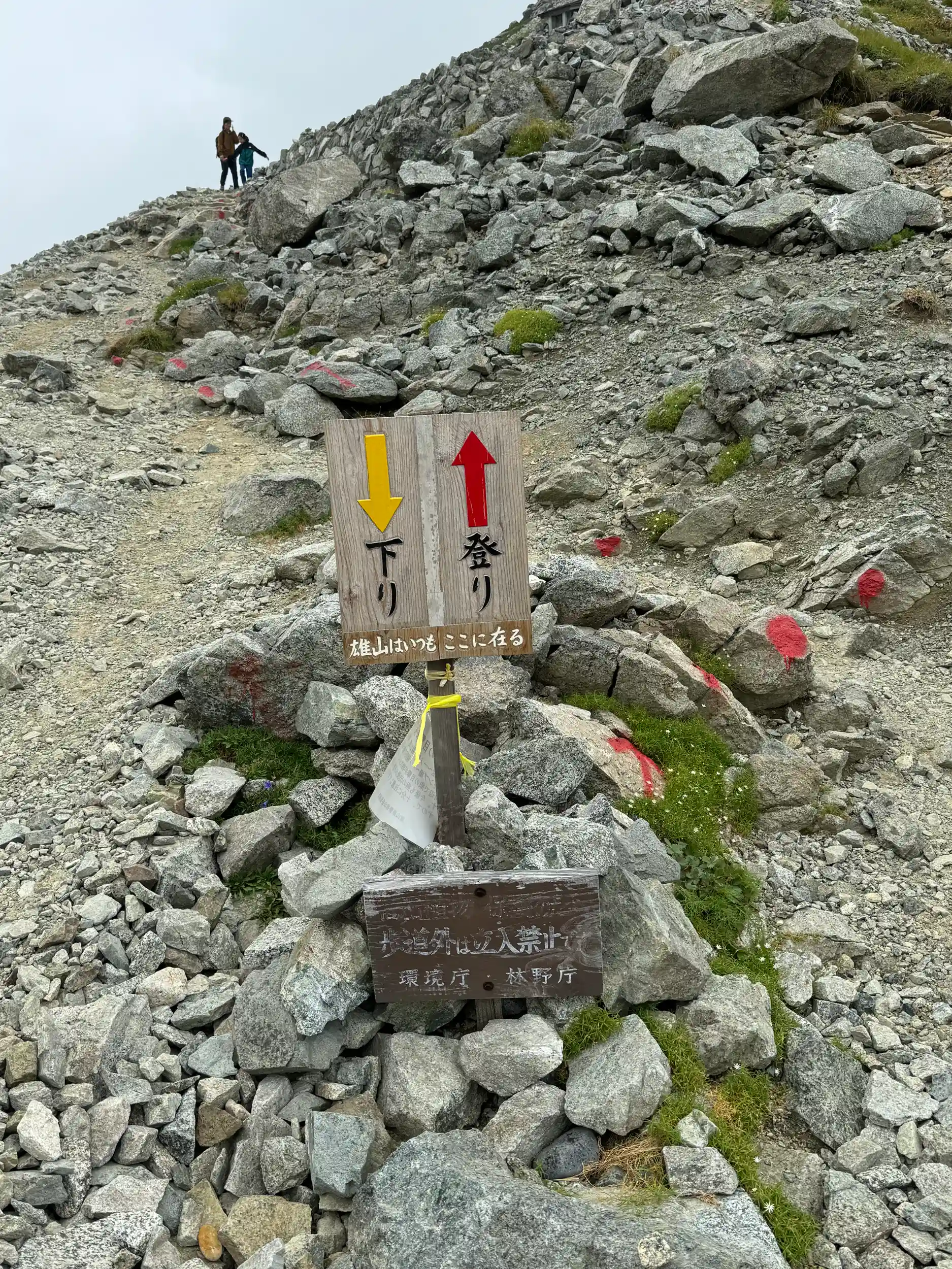 一の越山荘から頂上までは岩場みたいに見えますが登り用と降り用で登山道が色分けでマーキングされていて歩きやすいところを一歩一歩ひたすら登る感じです。