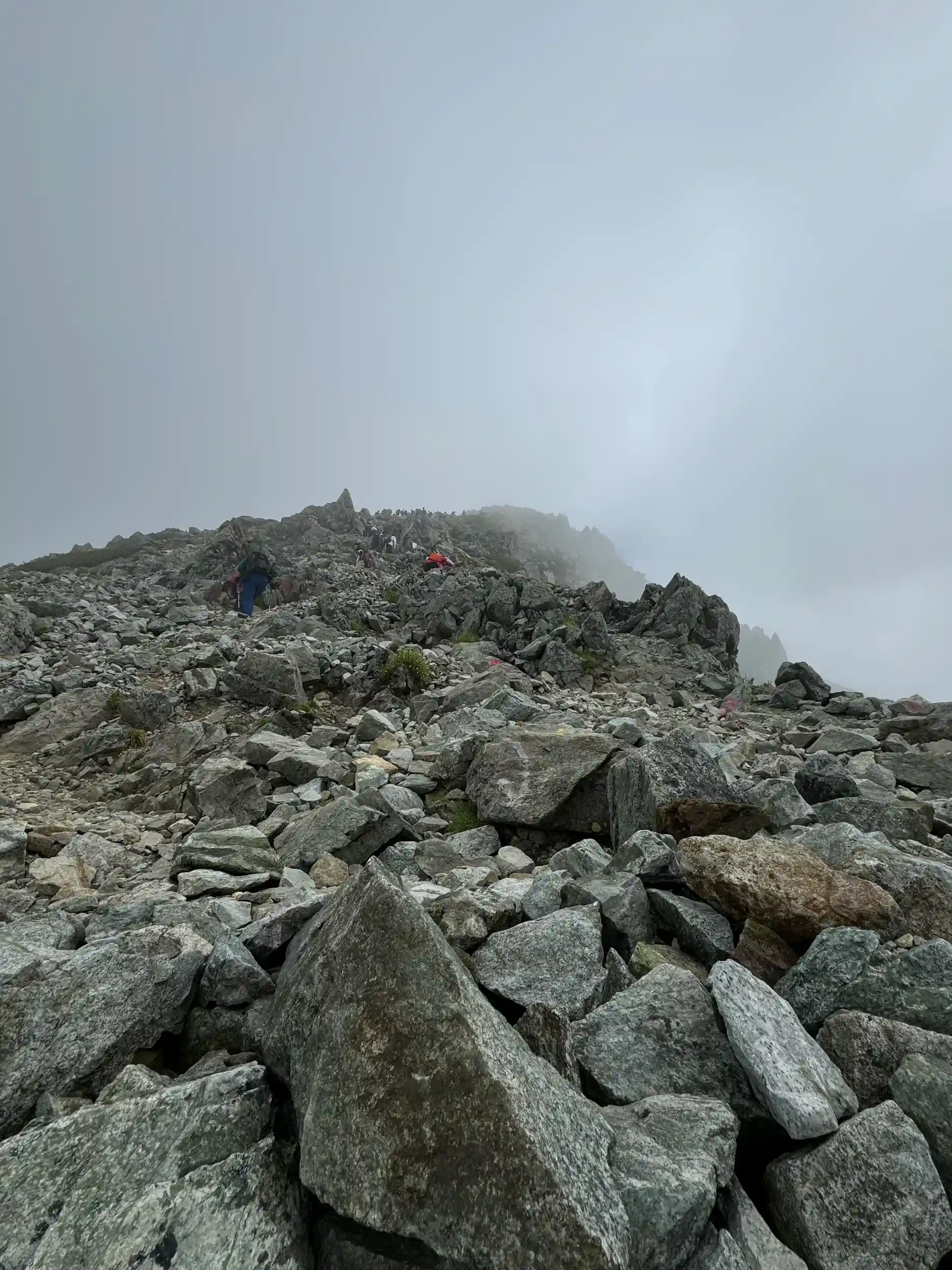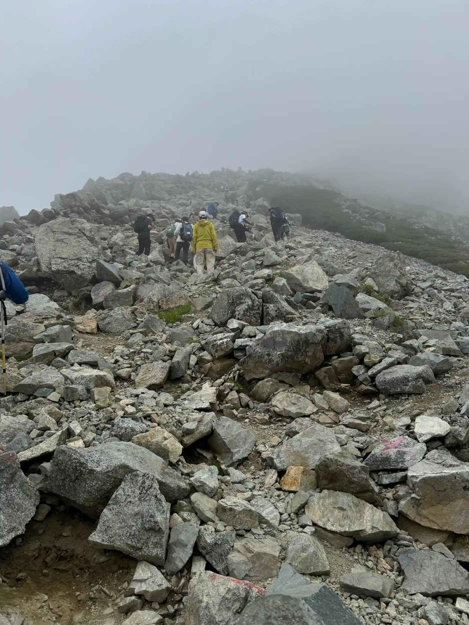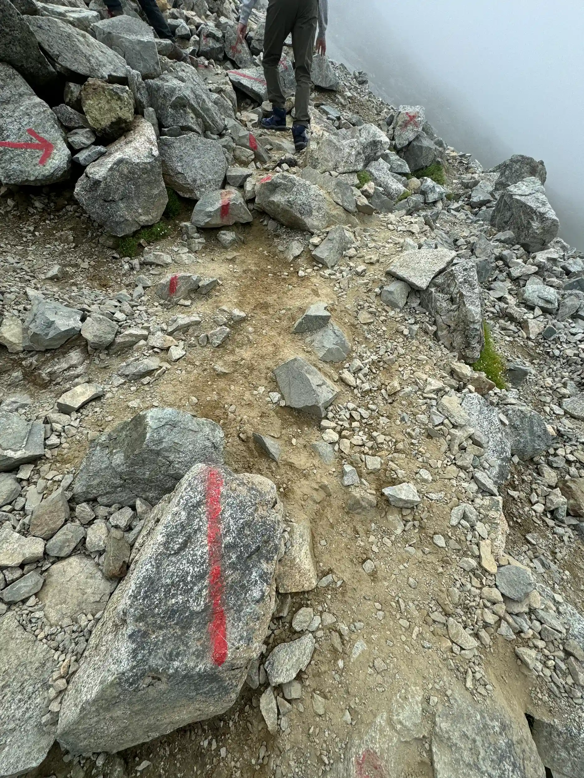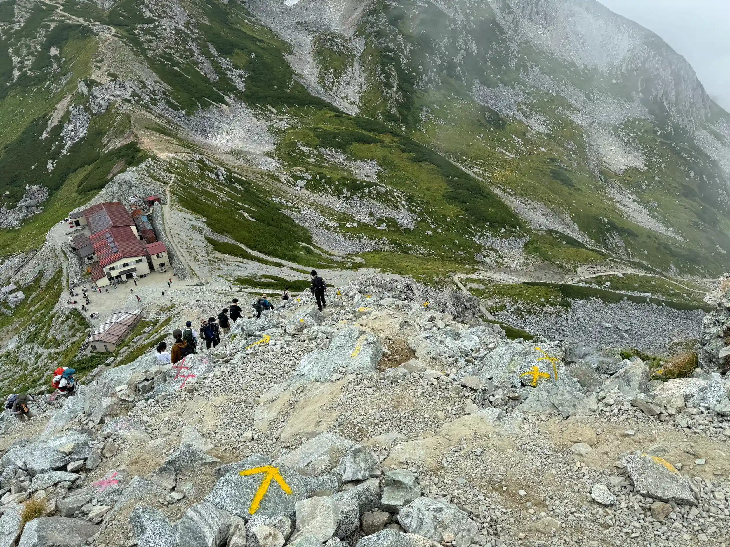 一の越山荘から頂上までは岩場みたいに見えますが登り用と降り用で登山道が色分けでマーキングされていて歩きやすいところを一歩一歩ひたすら登る感じです。