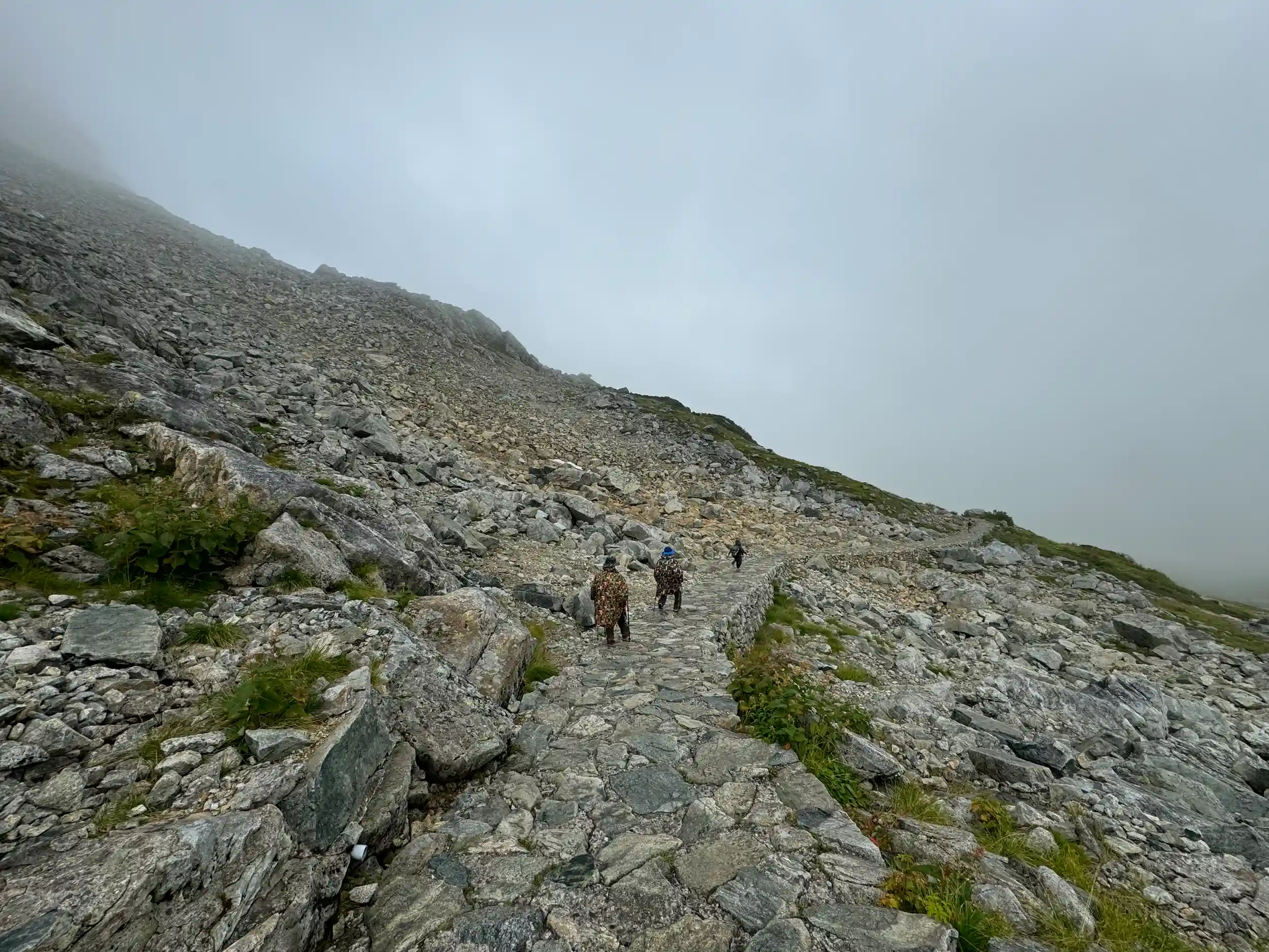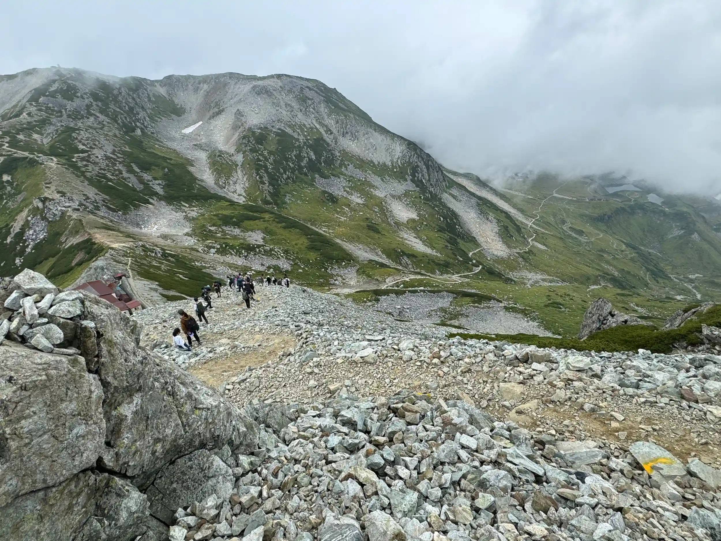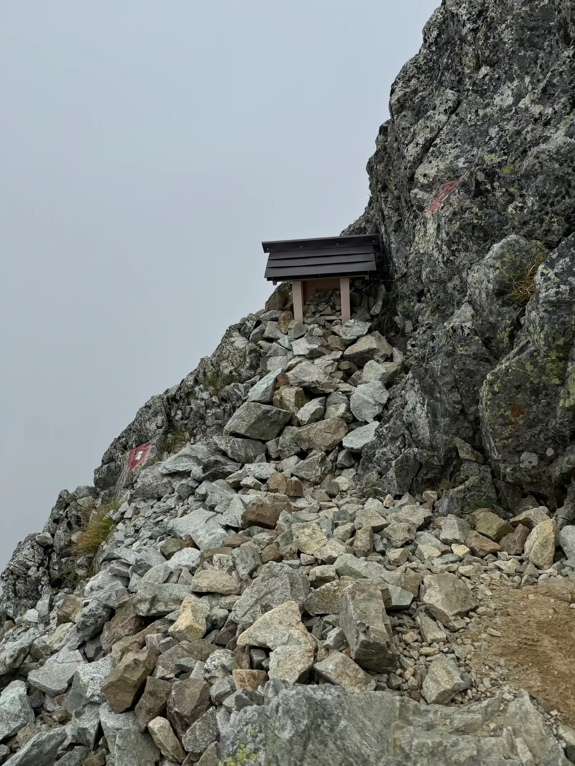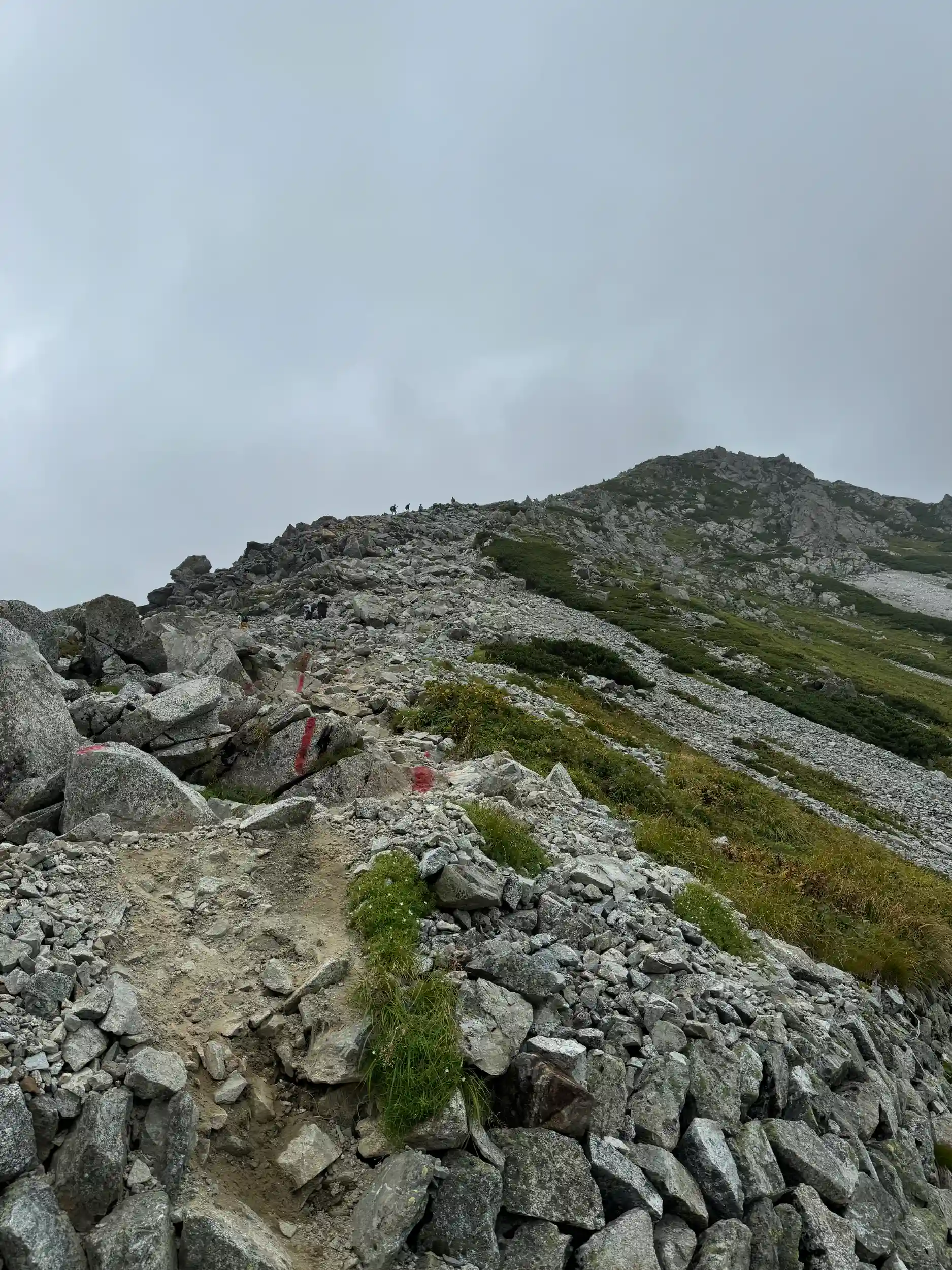 一の越山荘から頂上までは岩場みたいに見えますが登り用と降り用で登山道が色分けでマーキングされていて歩きやすいところを一歩一歩ひたすら登る感じです。