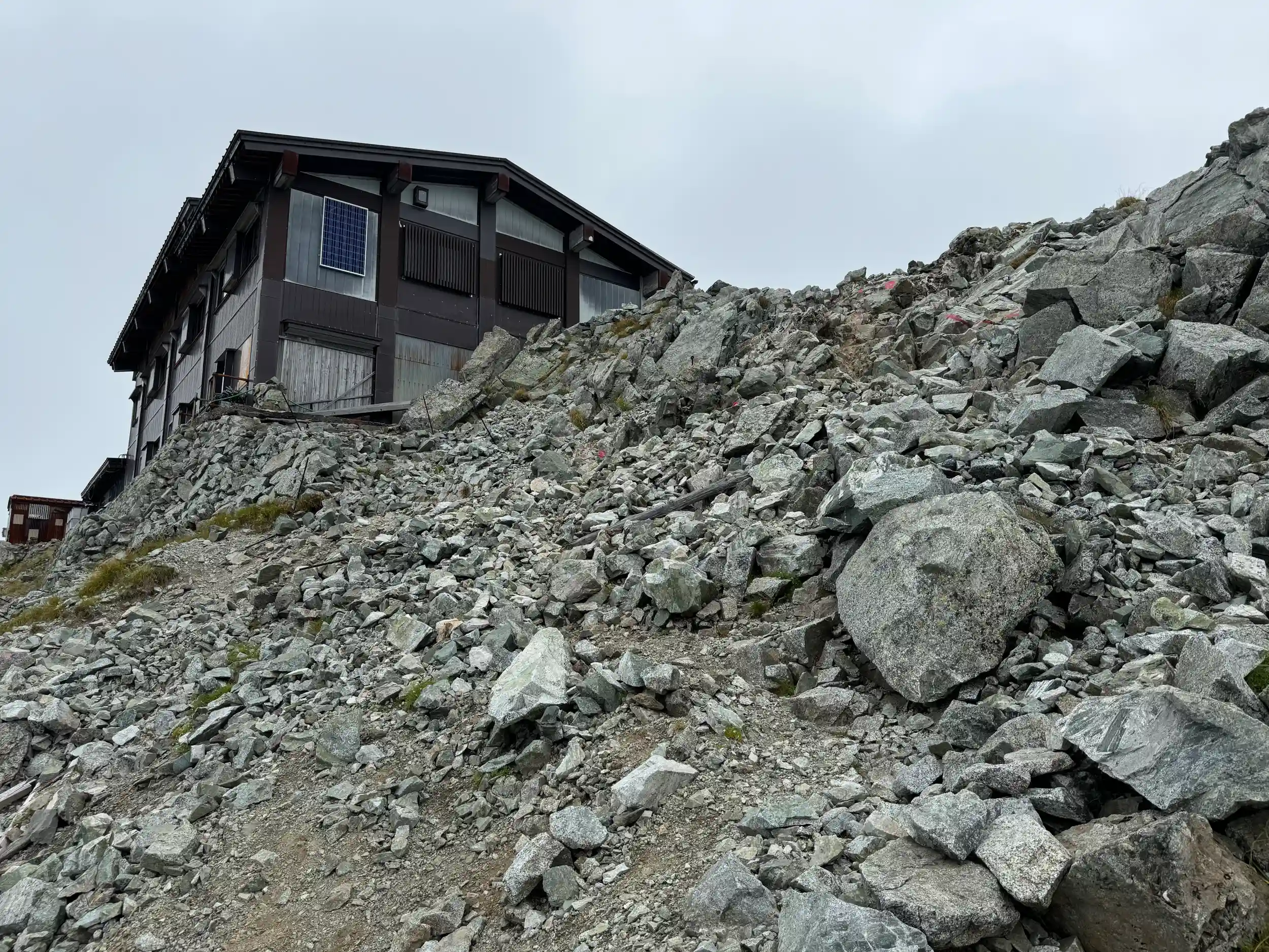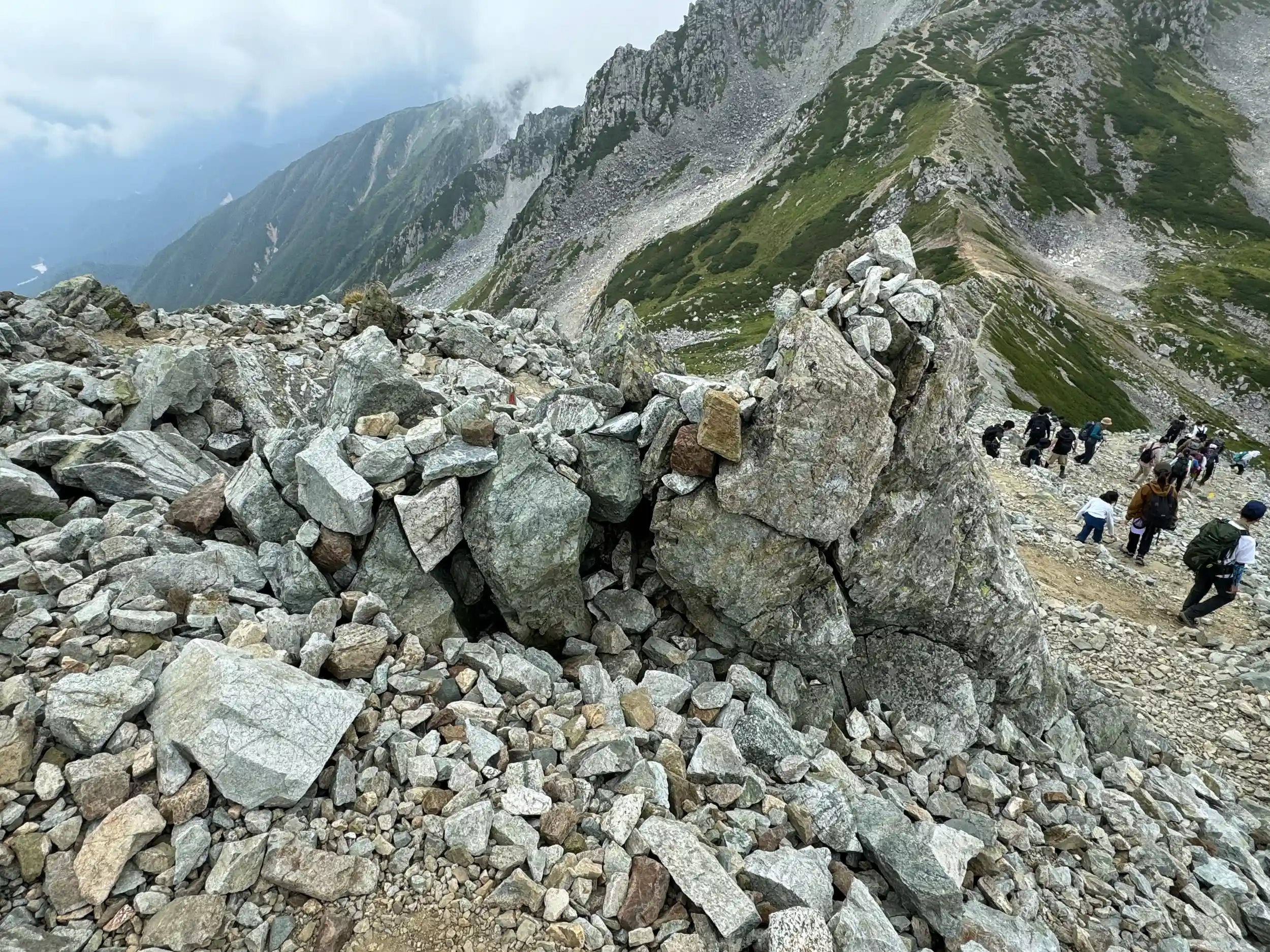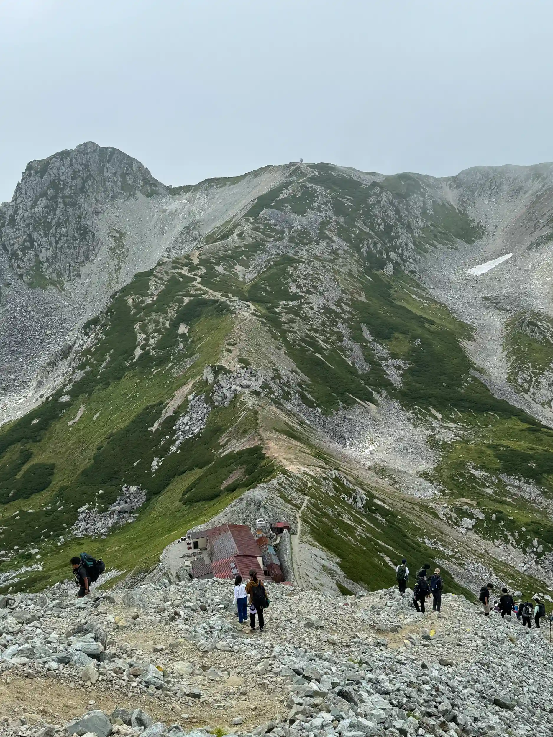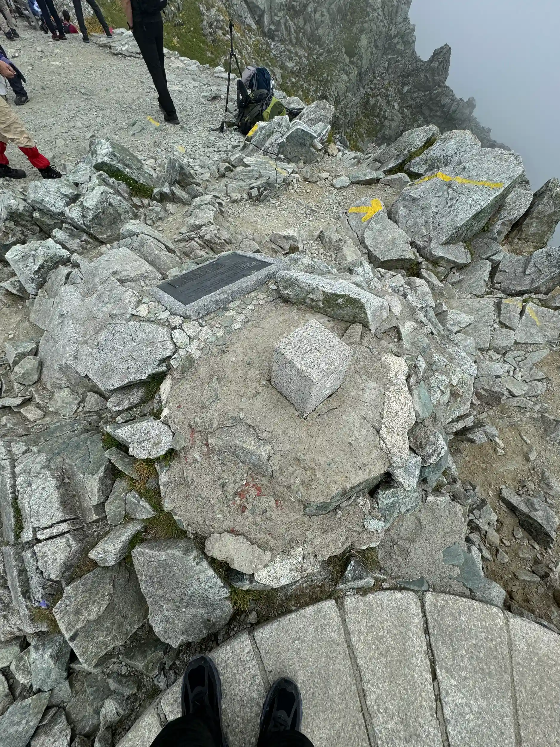 一の越山荘から頂上までは岩場みたいに見えますが登り用と降り用で登山道が色分けでマーキングされていて歩きやすいところを一歩一歩ひたすら登る感じです。