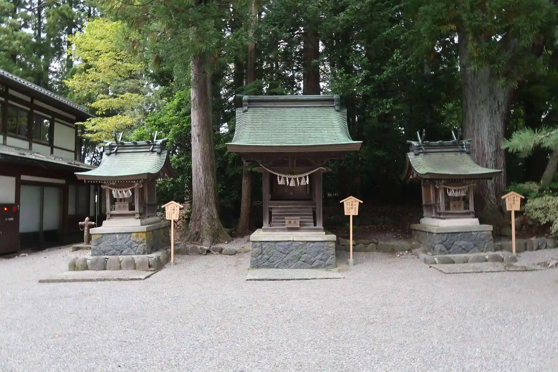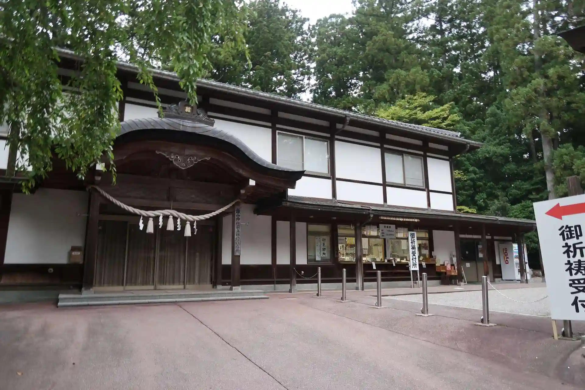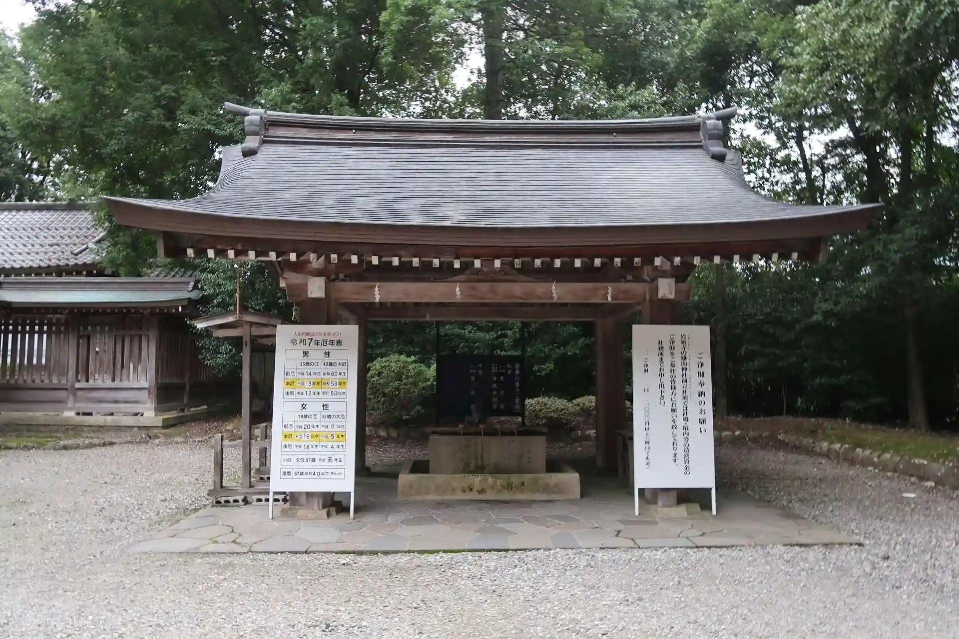 社務所の近くにもう1つの門(表神門)があり、どうもカーナビは裏側というか東神門側を案内した様でした。表神門の方が細い道を通らなくてもいいのでそちら側の駐車場へ行った方が良かったと思いますが、越中立山 多賀宮へも行かれる方は東神門から東へ少し行った所ですから東神門側が近くていいと思います。