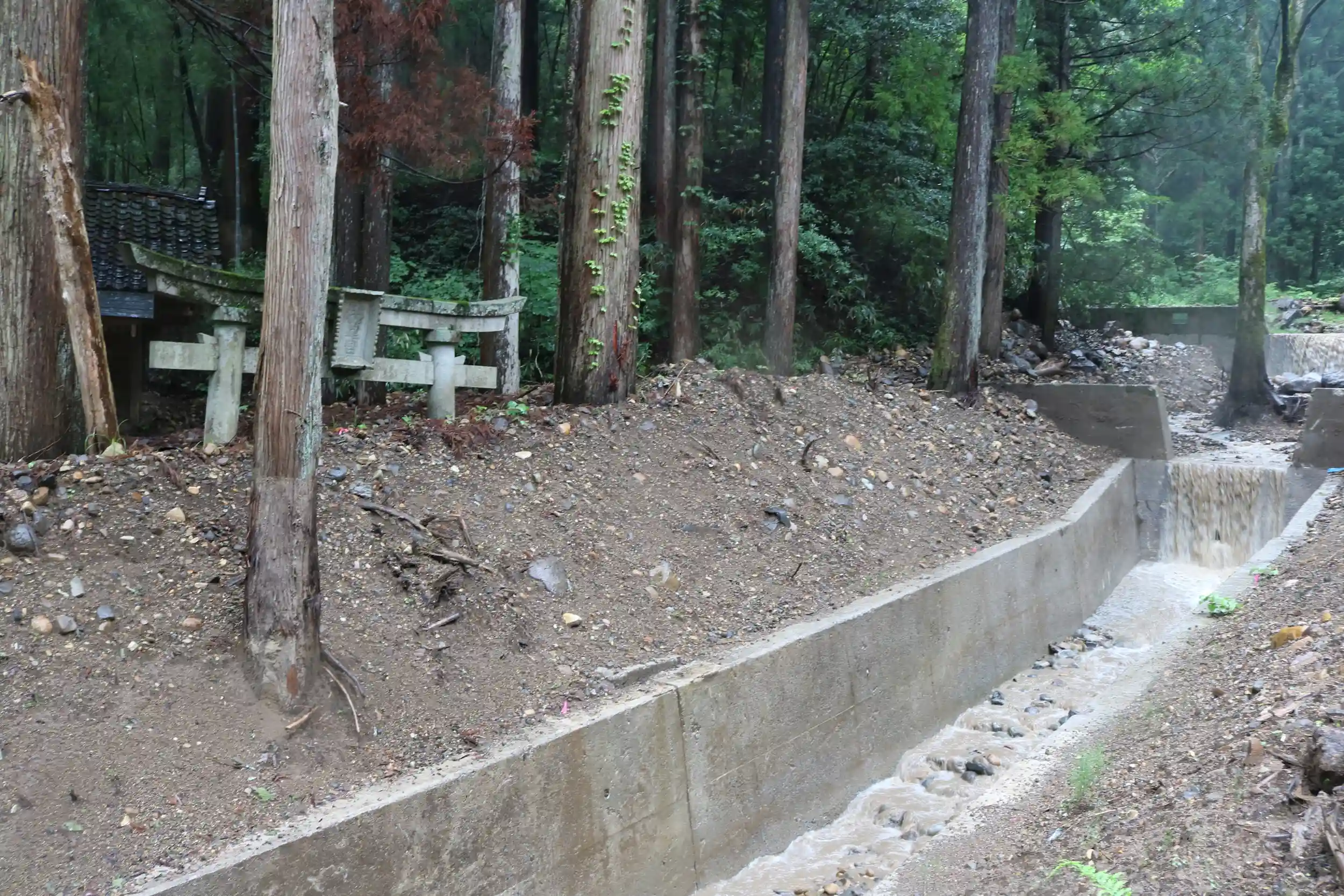 最近行われた土石流対策工事の護岸のコンクリートの向こう側でまだ埋まったままの鳥居
