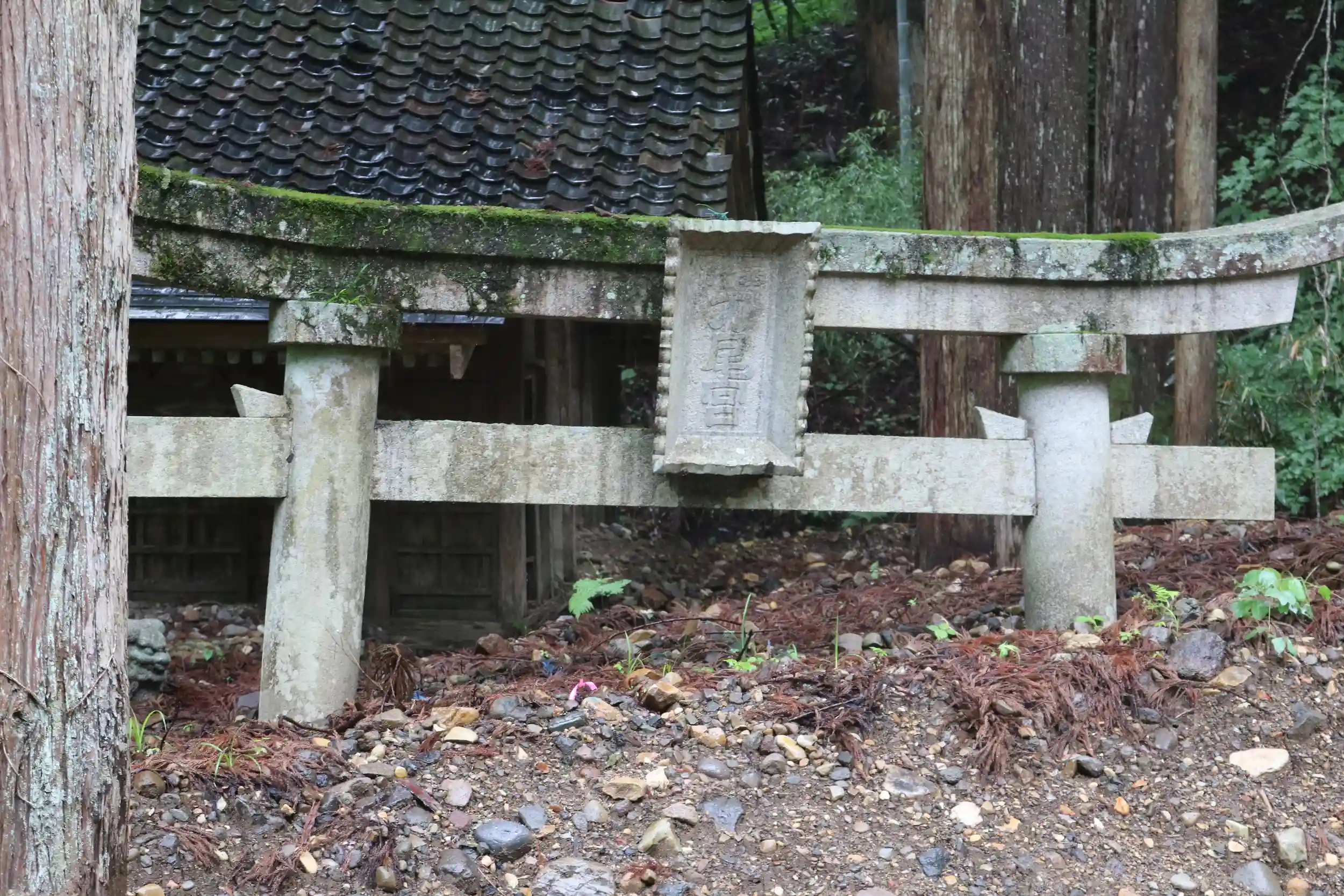 廃村巡りで辿り着きました。土石流で鳥居も埋まり、社殿までも土砂が流入ましたが、土石流対策の工事しても埋まったままになっています。