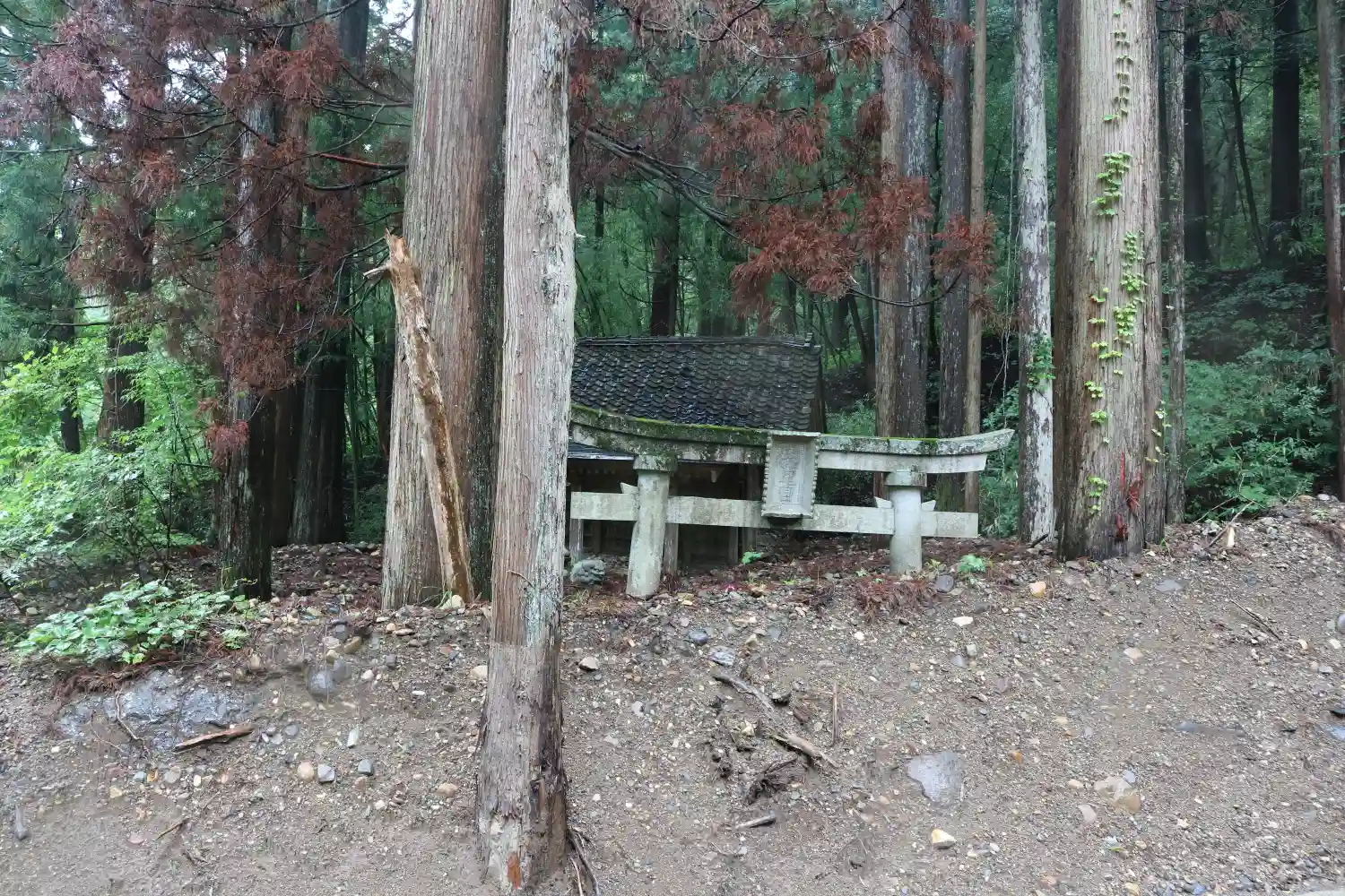 廃村巡りで辿り着きました。土石流で鳥居も埋まり、社殿までも土砂が流入ましたが、土石流対策の工事して…