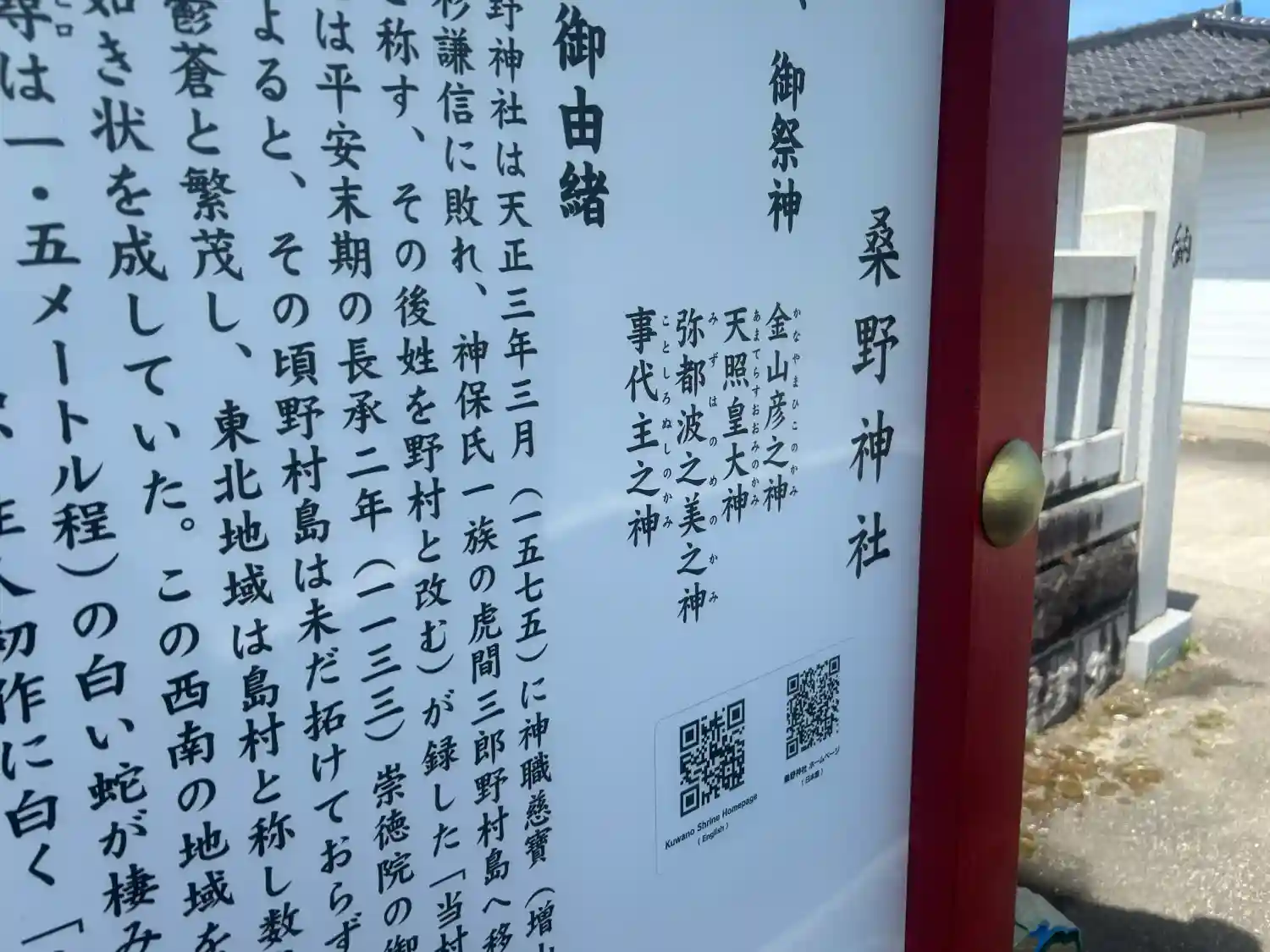 神石は金山彦之神として桑野神社のご神体となって鎮座され現在に至っているとのこと。
