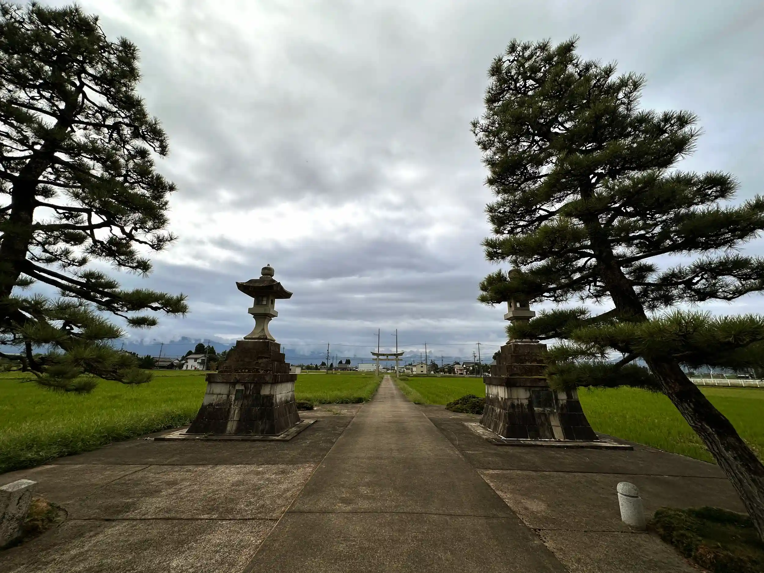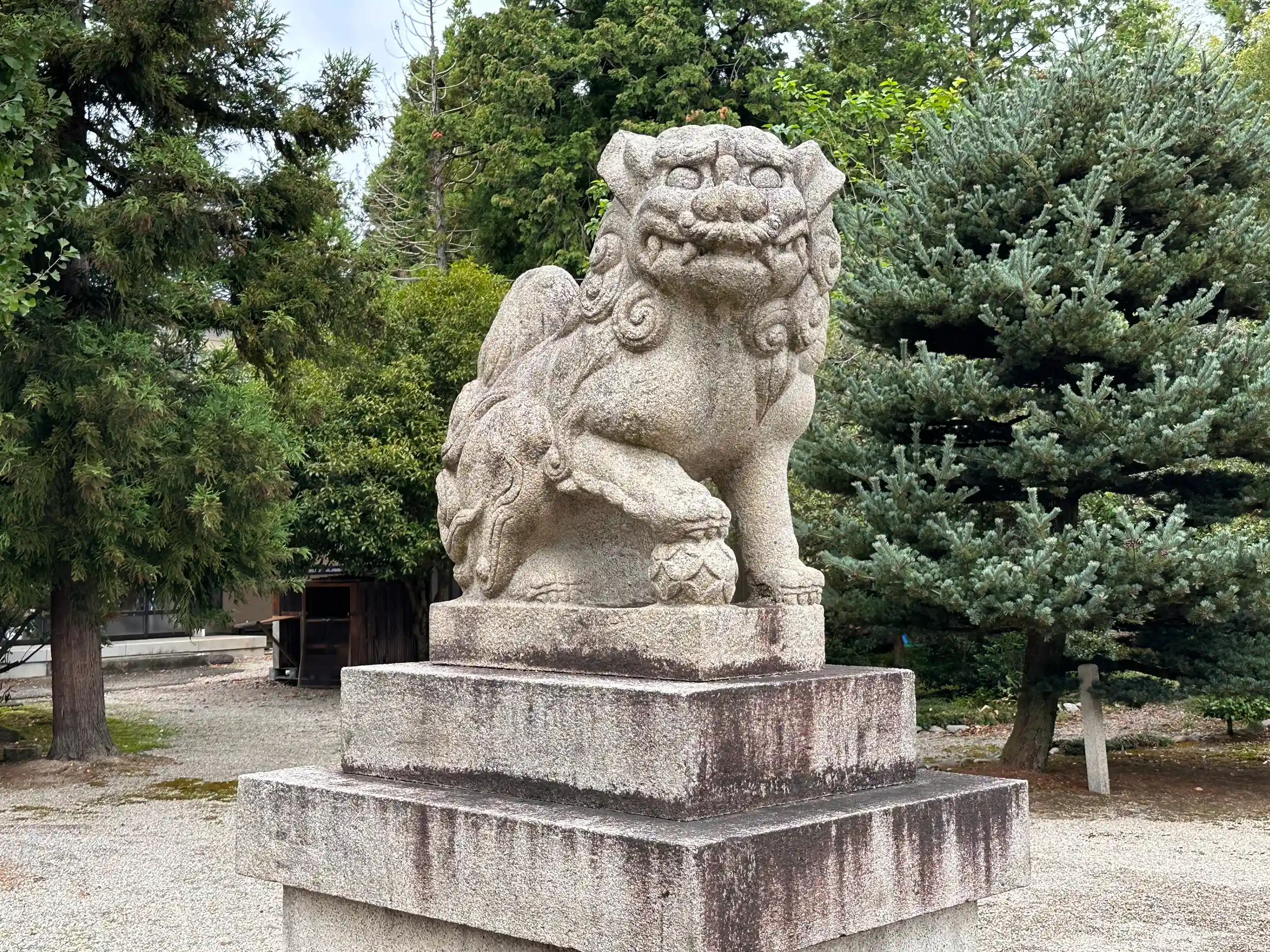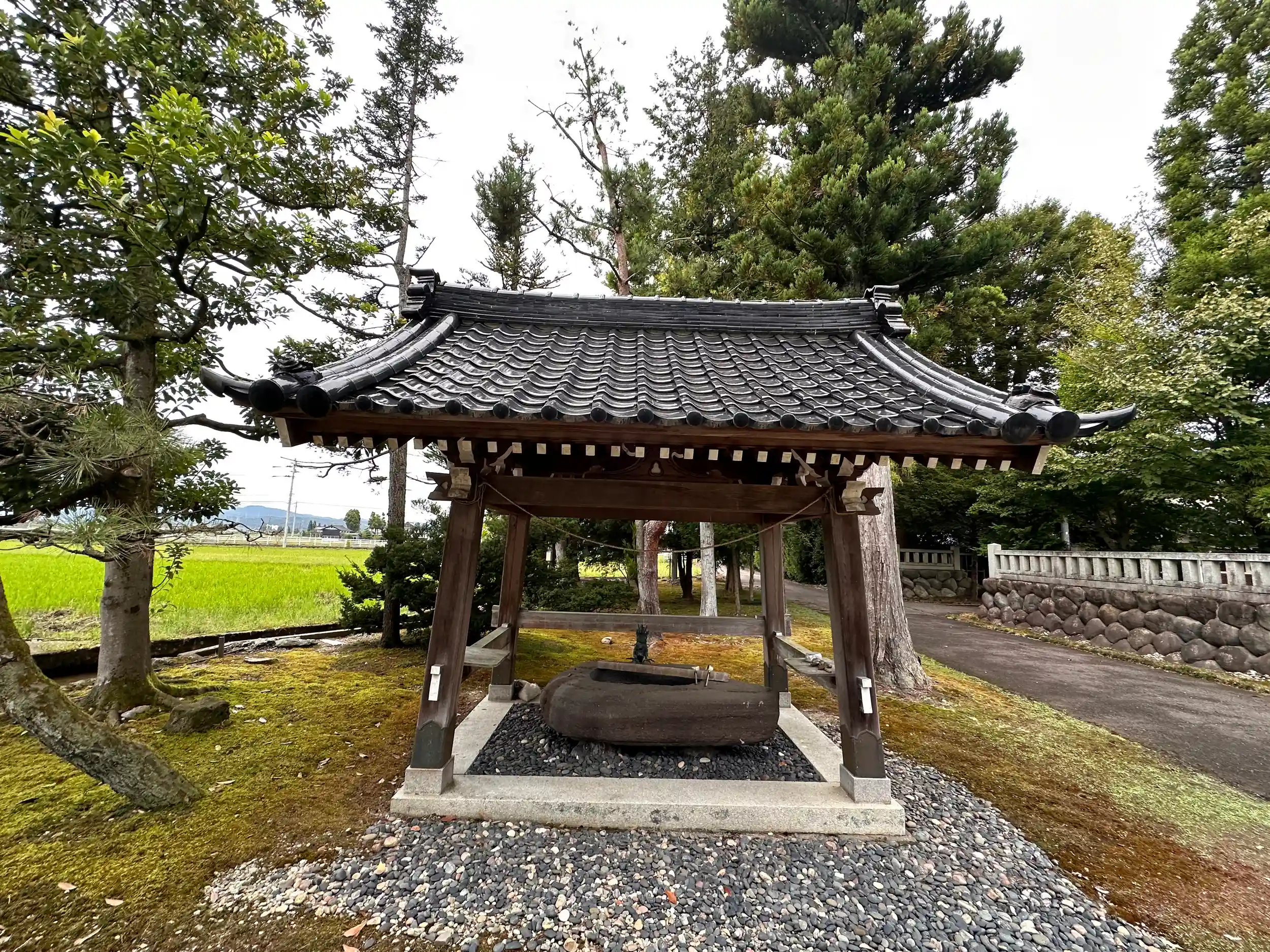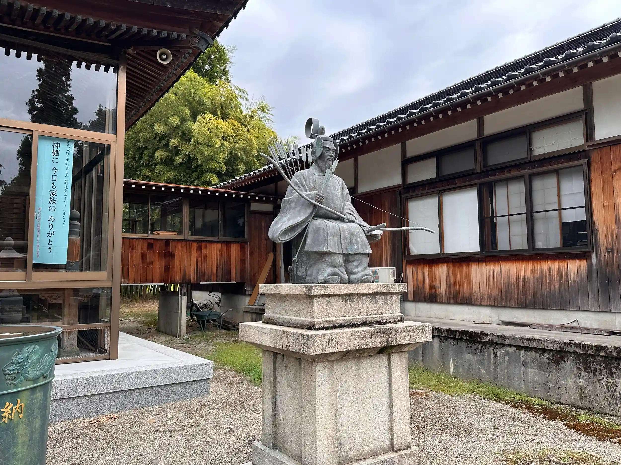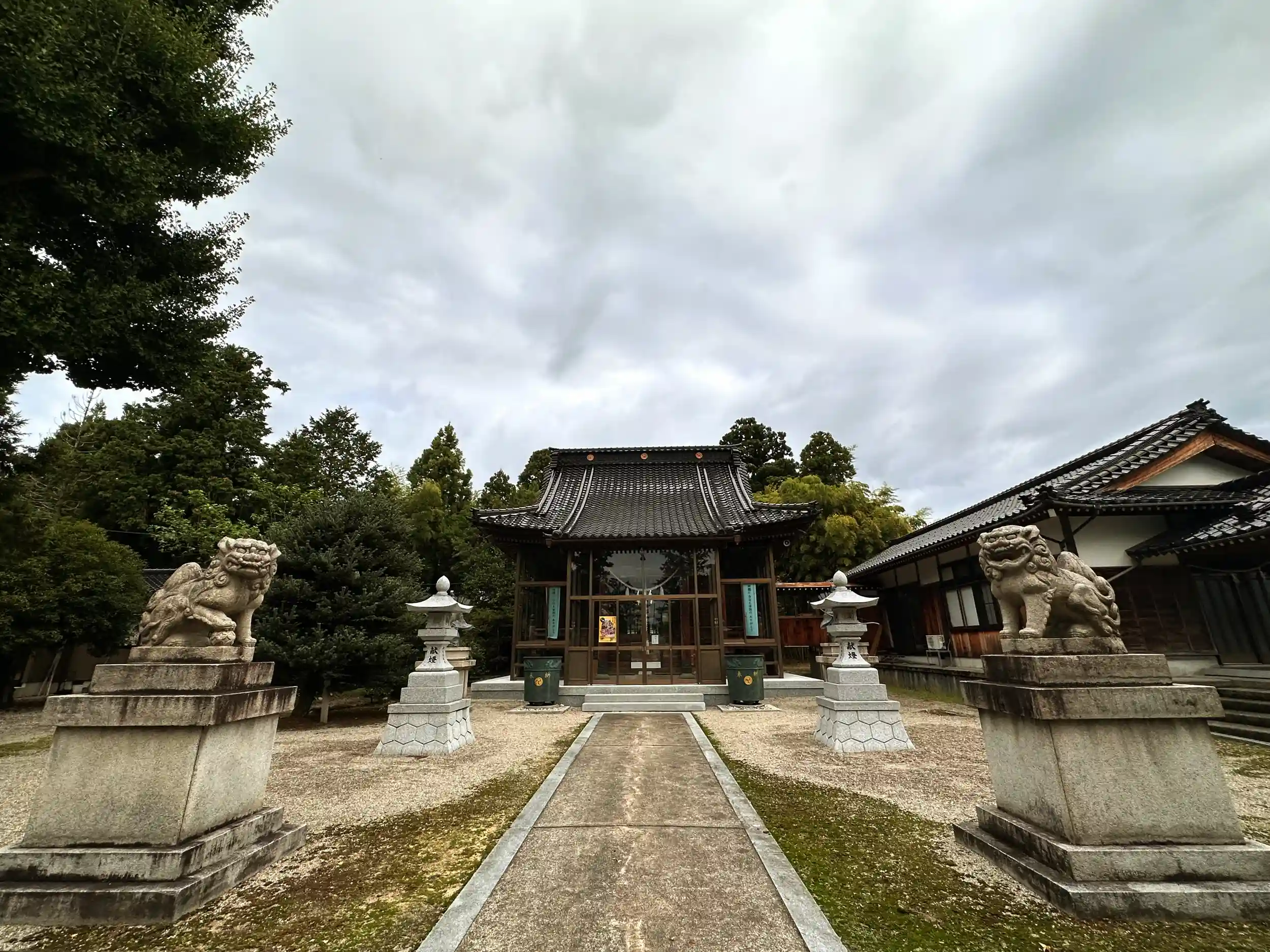 道路沿いの、社号票が目につき早速参拝しました、参道鳥居を抜けると境内鳥居があり 正面にサッシに囲まれている拝殿があります、雪の多い地方ではサッシが多いですね、関西ではあまり見かけません、拝殿前に随神座像が立っています、御朱印頂けますがこの日はご不在のようでした