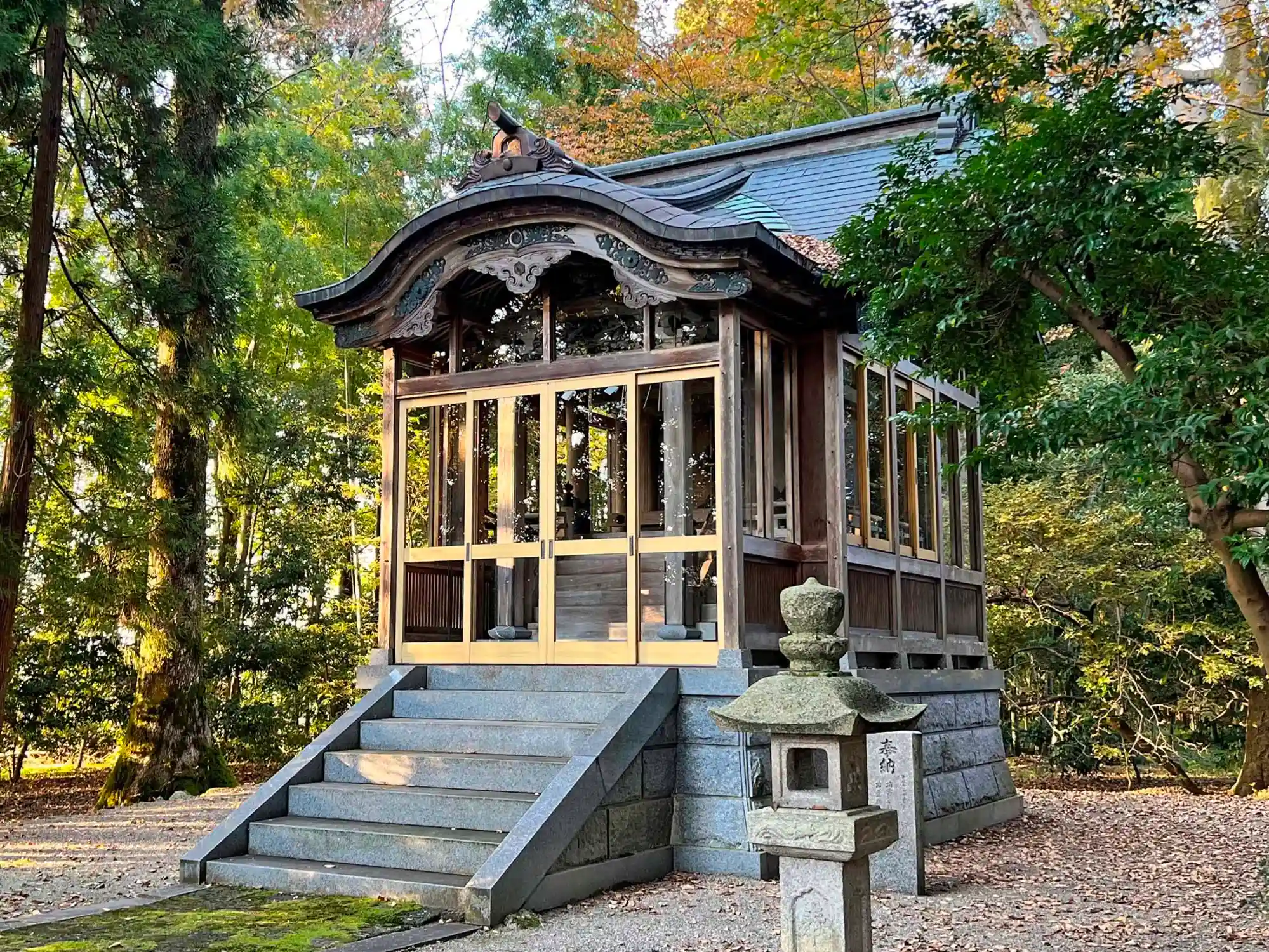 当社は、JR城端線・福野駅の南東3kmの田園地帯の中の平地にある。田んぼの中の森全体が当社境内になっていて、大社らしく広々としている。境内の造りは割とシンプルで、大きな社殿とその周りにいくつかの境内社、その南側の参道脇に社務所や宝物殿などがあるぐらい。一宮の中では、ややコンパクトな方なのかと思われる。