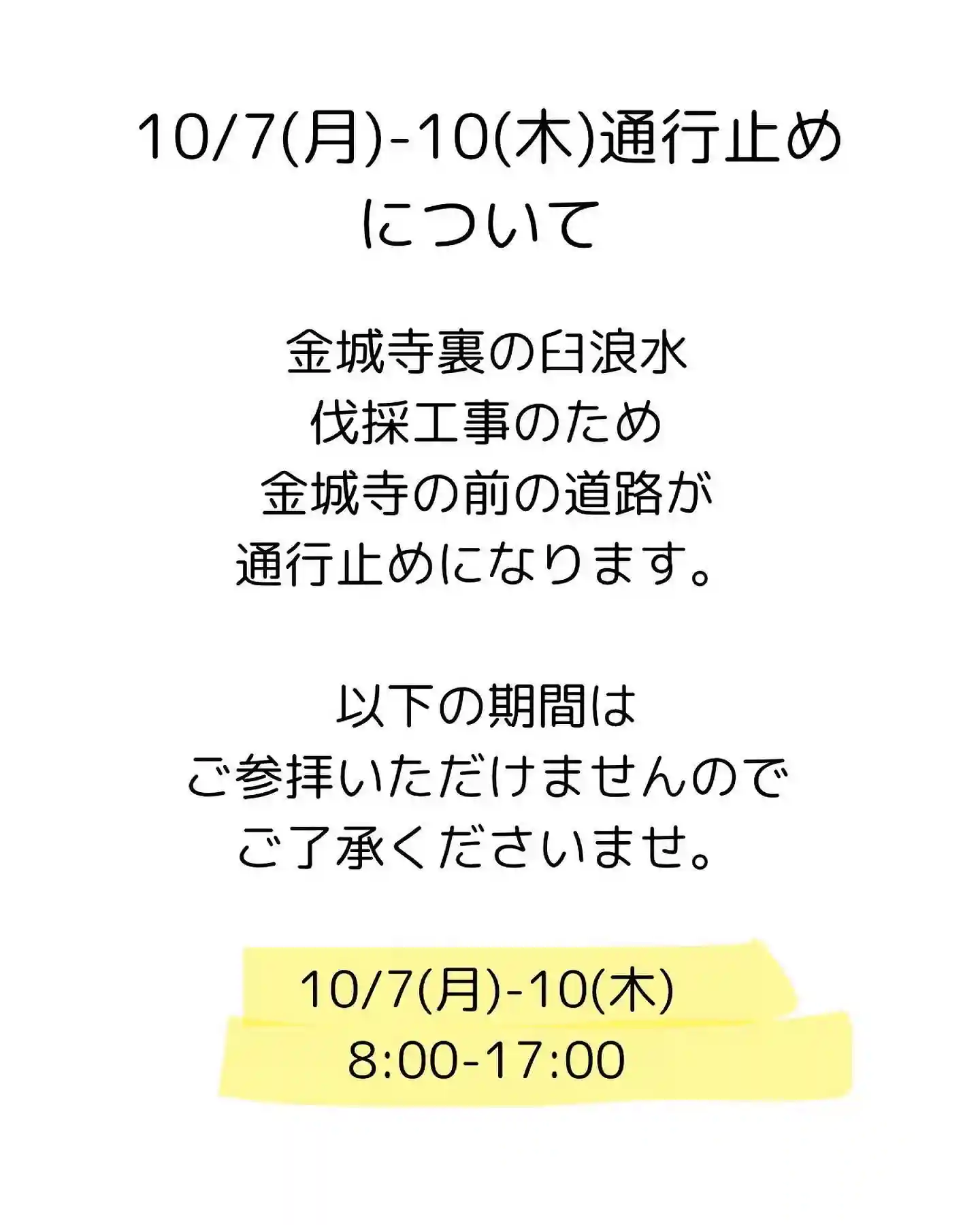 明日から金城寺前が通行止めになります。