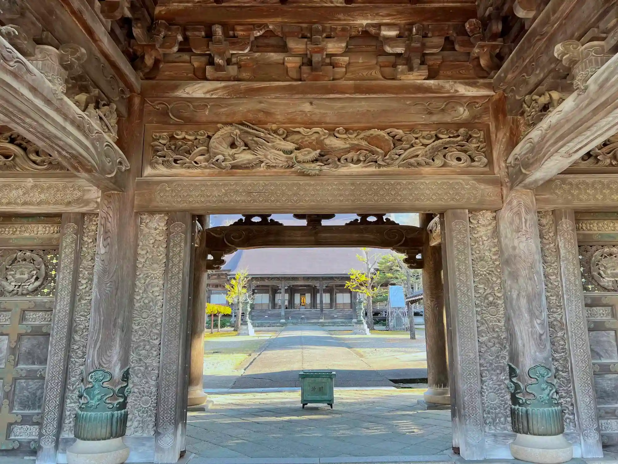 <山門>をくぐる。入口の上部にあるのが「昇竜伝説」のある龍の彫刻「雲水一匹龍」。
