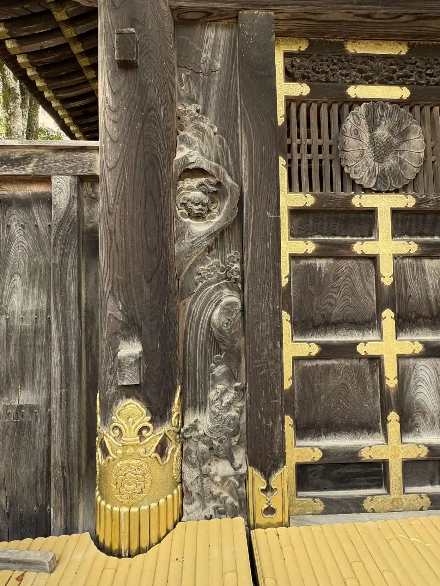 ~境内の広さ、本堂の屋根の巨大さ、太子堂の優美さ、どれをとっても類を見ないものばかりだ。さすがに「信仰と木彫りの里」井波と盛衰をともにしてきた寺である。現在の伽藍は、どこを見ても非常に見事な井波彫刻で飾られている。山門のレリーフ、堂内の欄間や柱、屋根の妻飾りや破風などにまで、ことごとく彫刻が使われていた。~