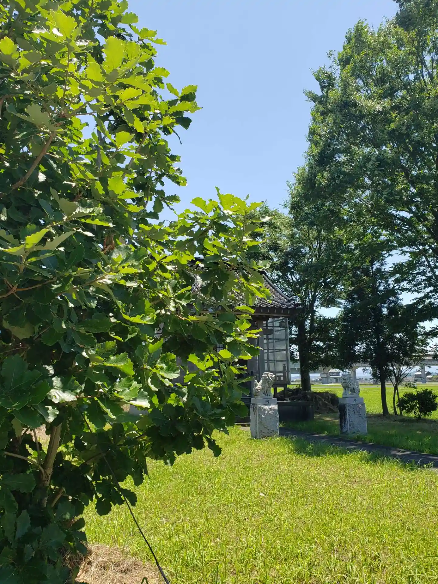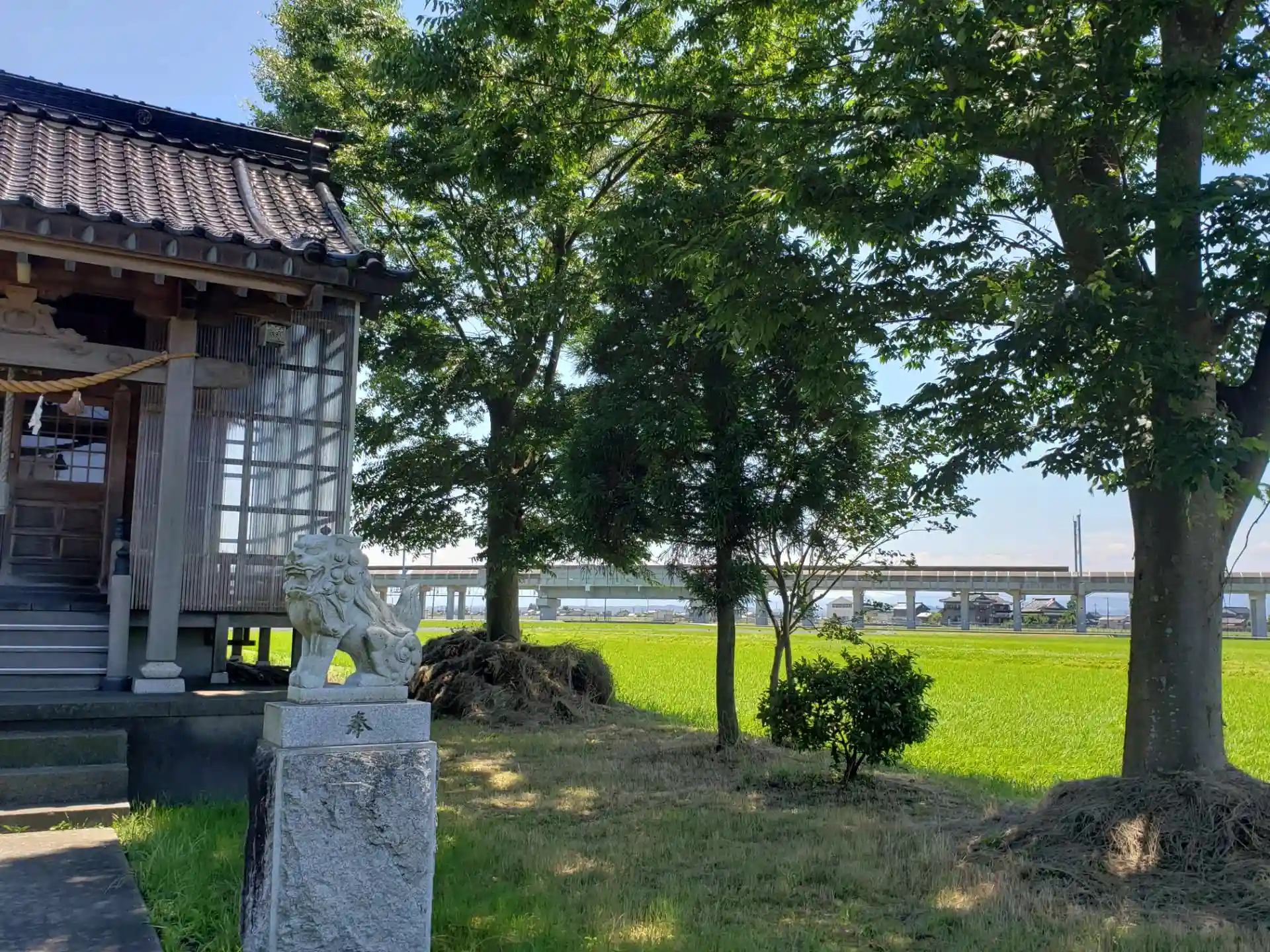 田んぼの中にある神社です。マーライオン似の狛犬さんがいらっしゃいます。