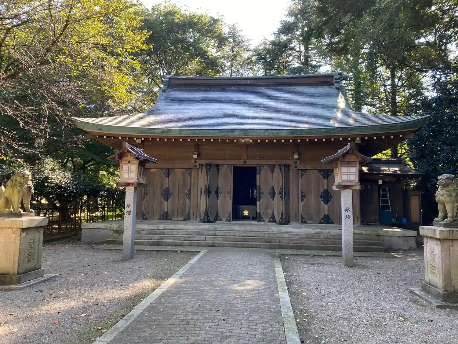 <拝殿>正面。珍しいのは、一般的な「蔀戸(しとみど)」(戸の上半分が上に開く戸)ではなく、「折り戸」が採用されていること。