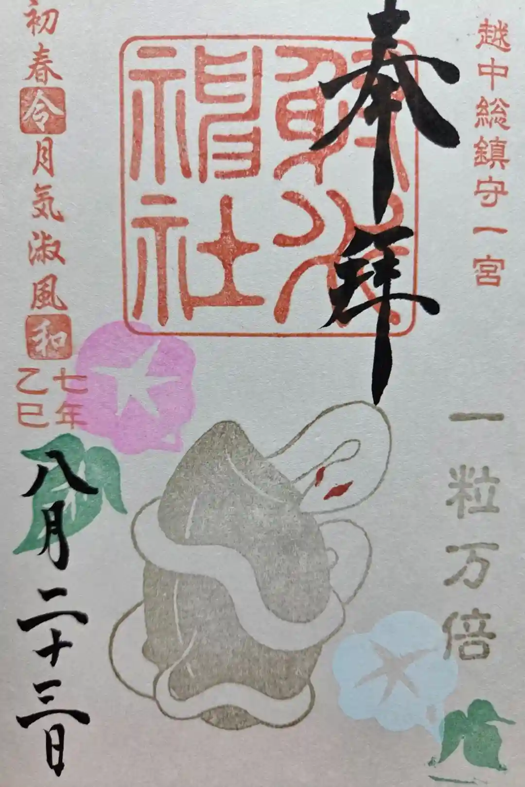 | 御朱印 | あり 右上に越中総鎮守一宮の印、真ん中に射水神社の社印、左上に初春令月気淑風和の印が押されています。