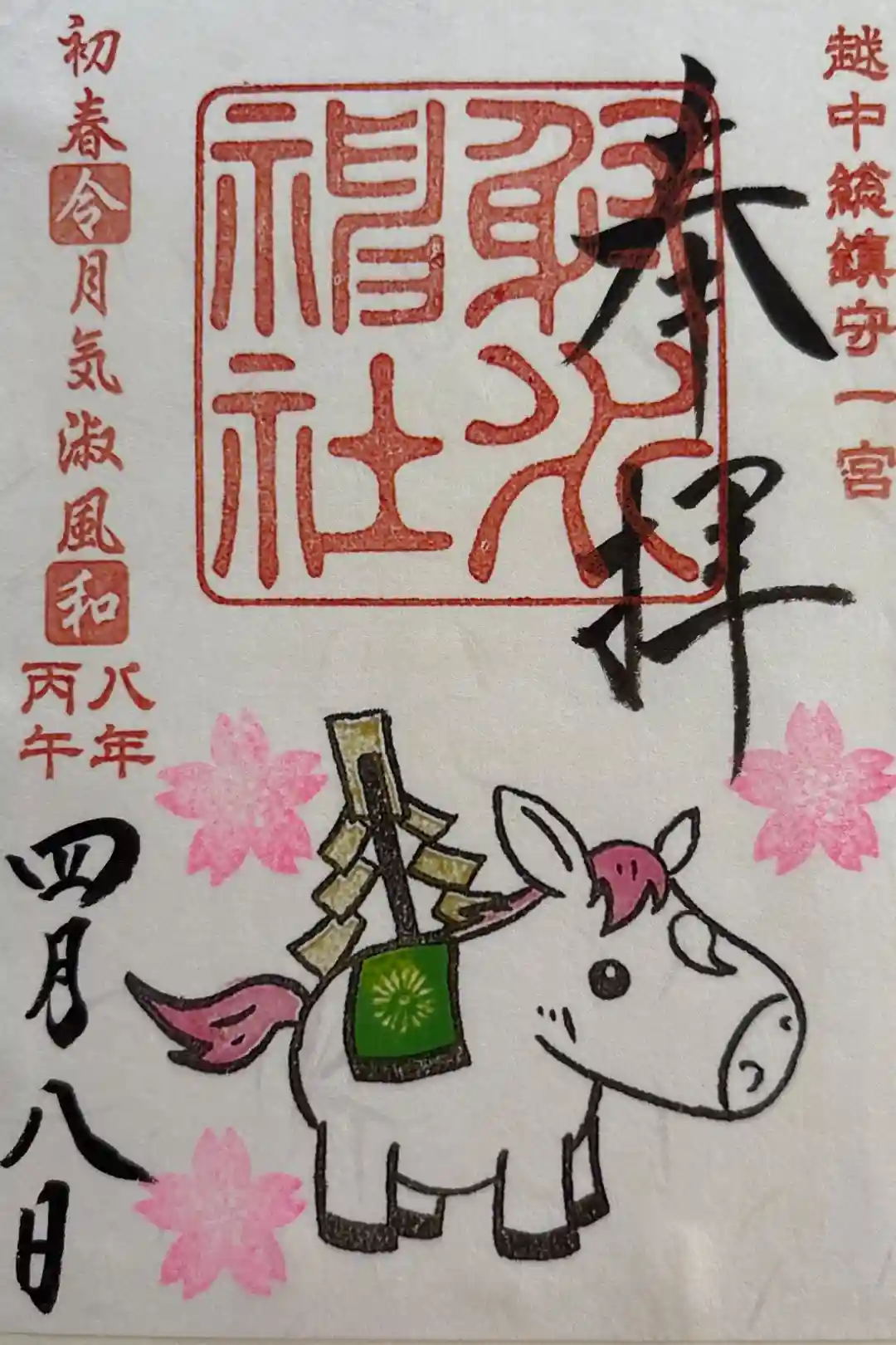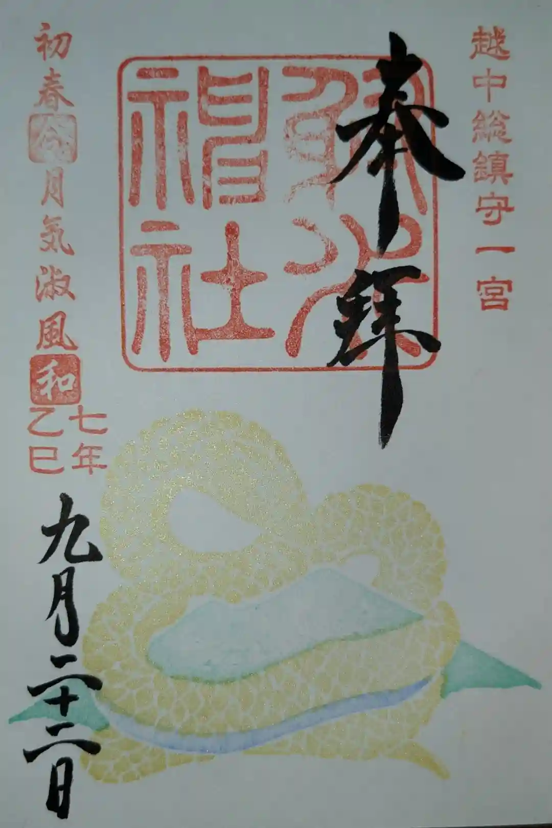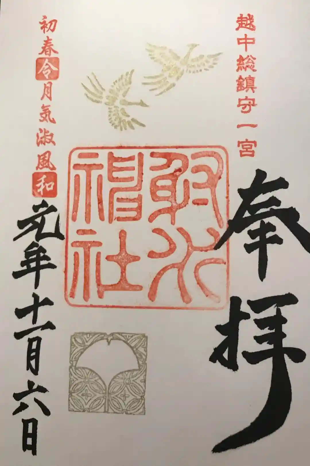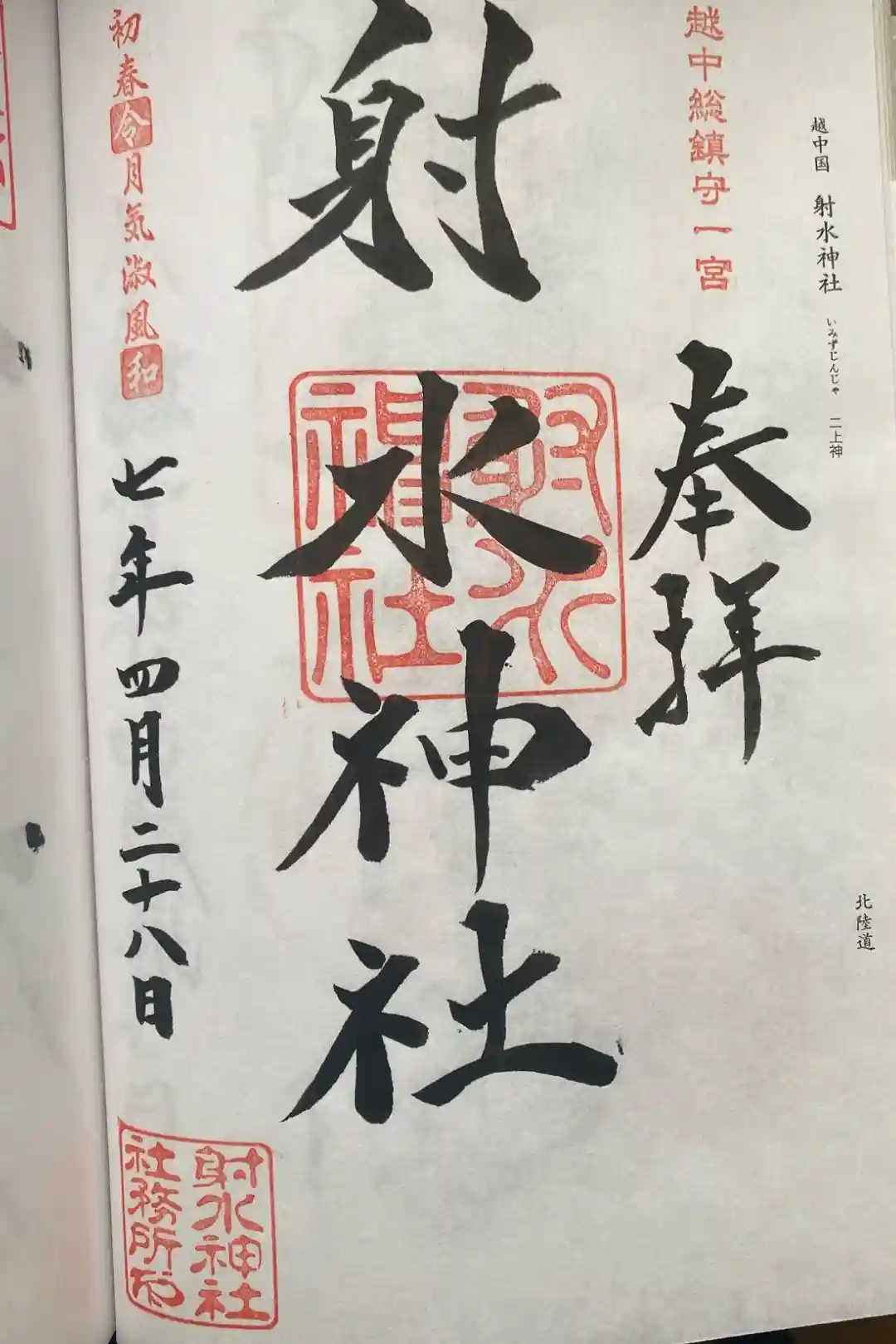 右上に越中総鎮守一宮の印、真ん中に射水神社の社印、左上に初春令月気淑風和の印が押されています。