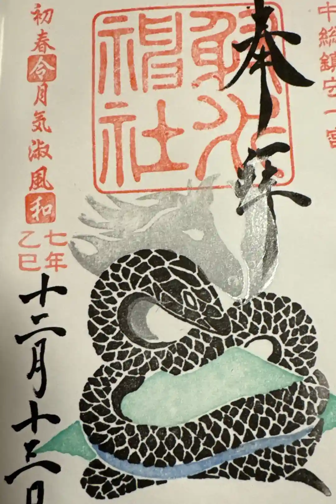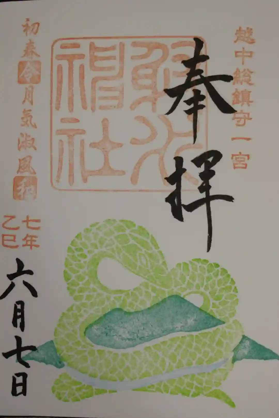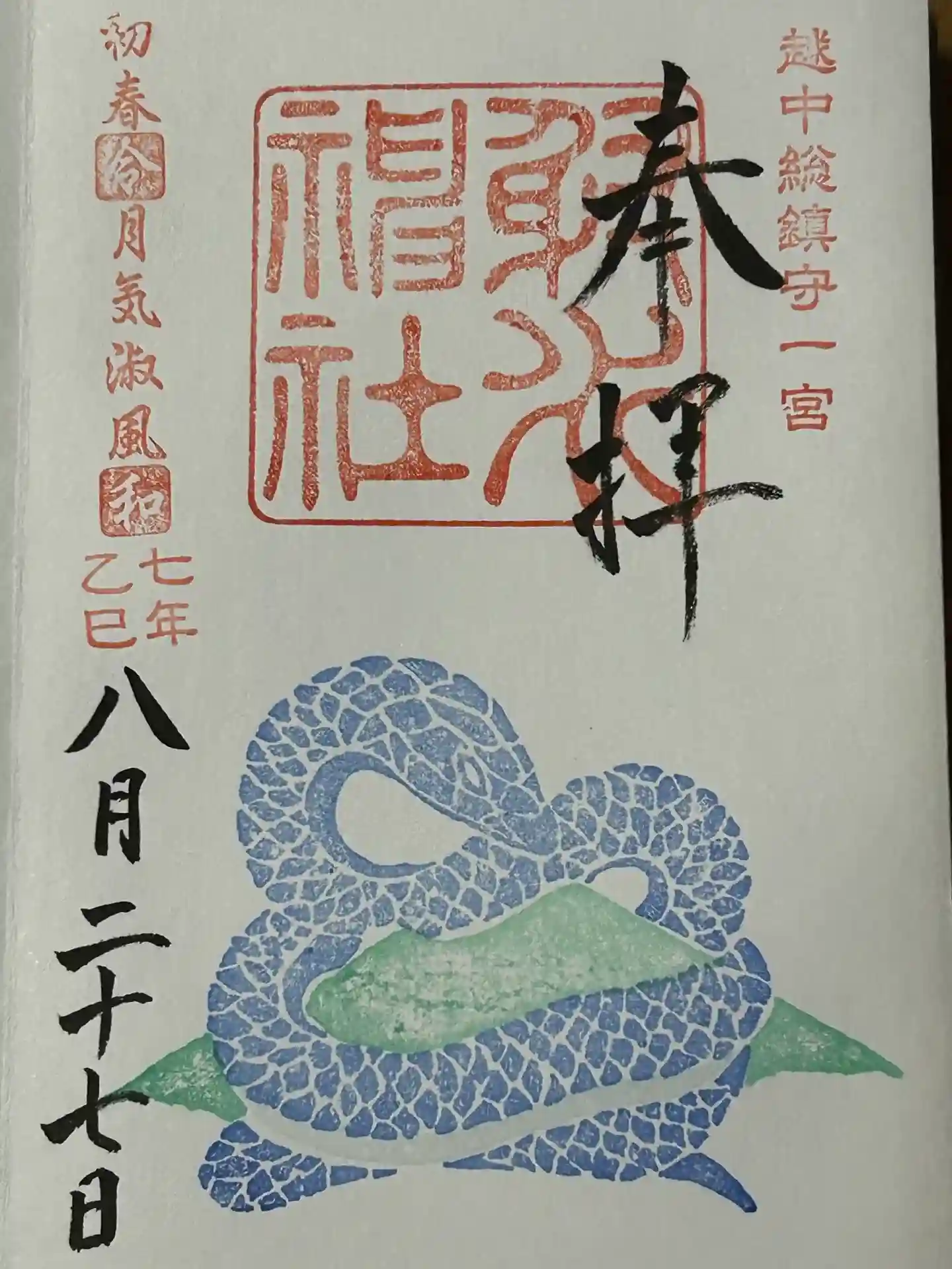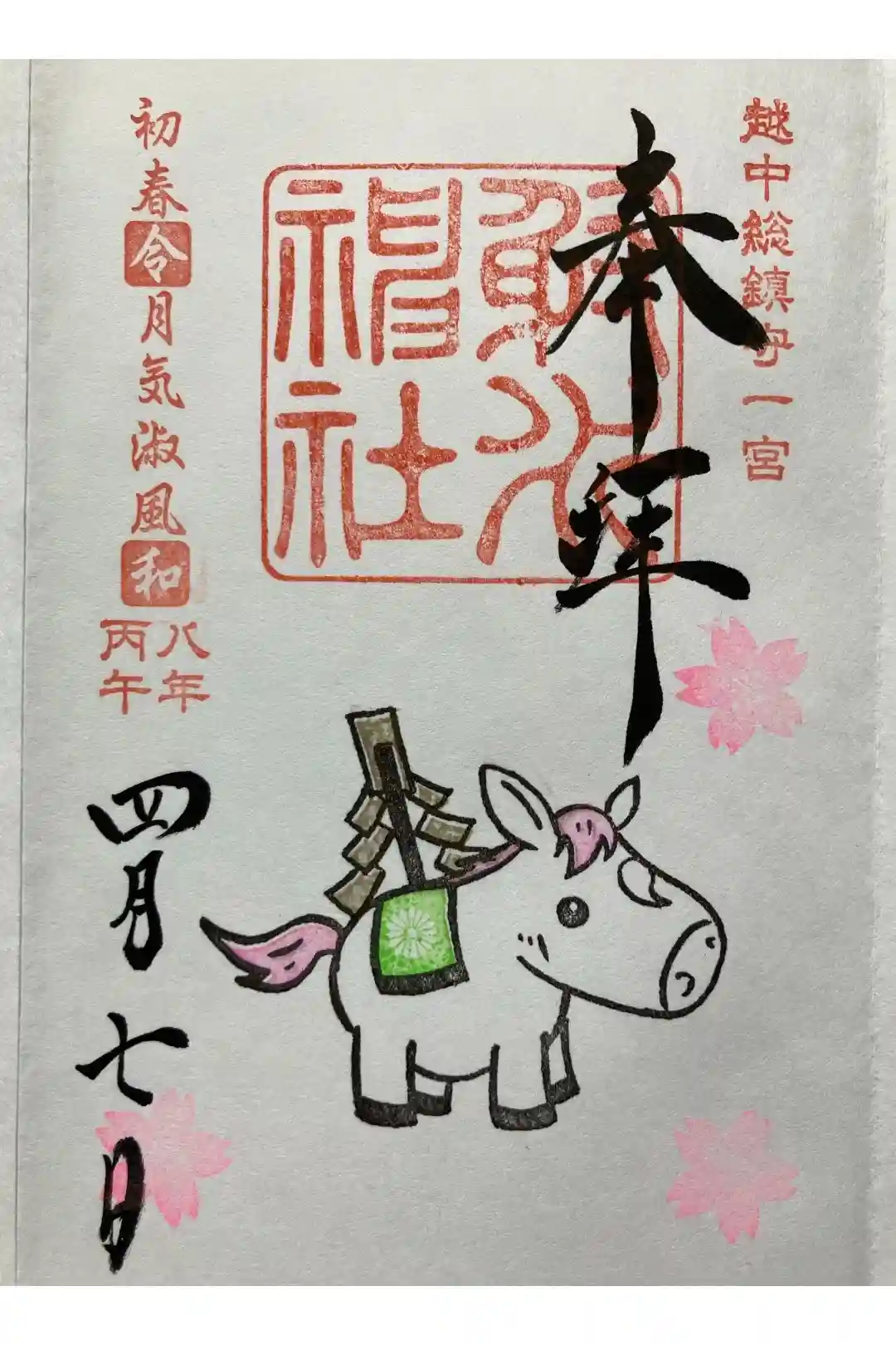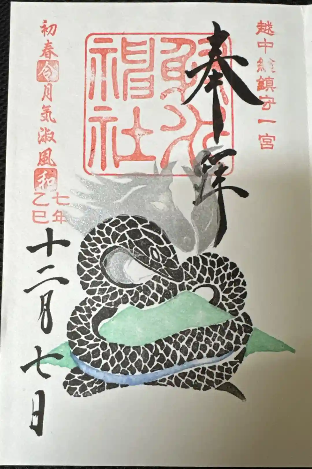 右上に越中総鎮守一宮の印、真ん中に射水神社の社印、左上に初春令月気淑風和の印が押されています。