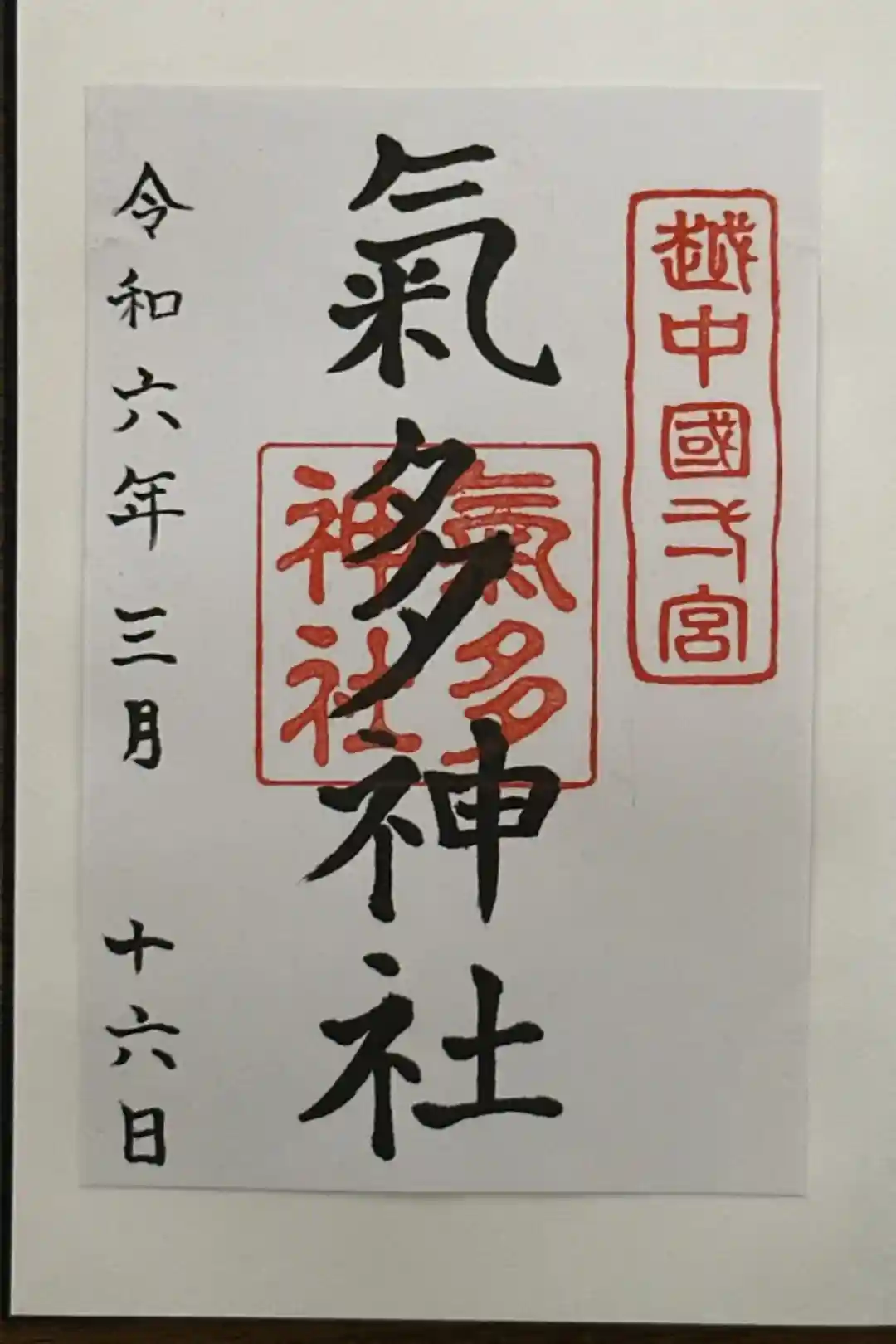 真ん中に気多神社と書かれ、右上に越中国一宮の印、真ん中に気多神社の社印が押された御朱印です。