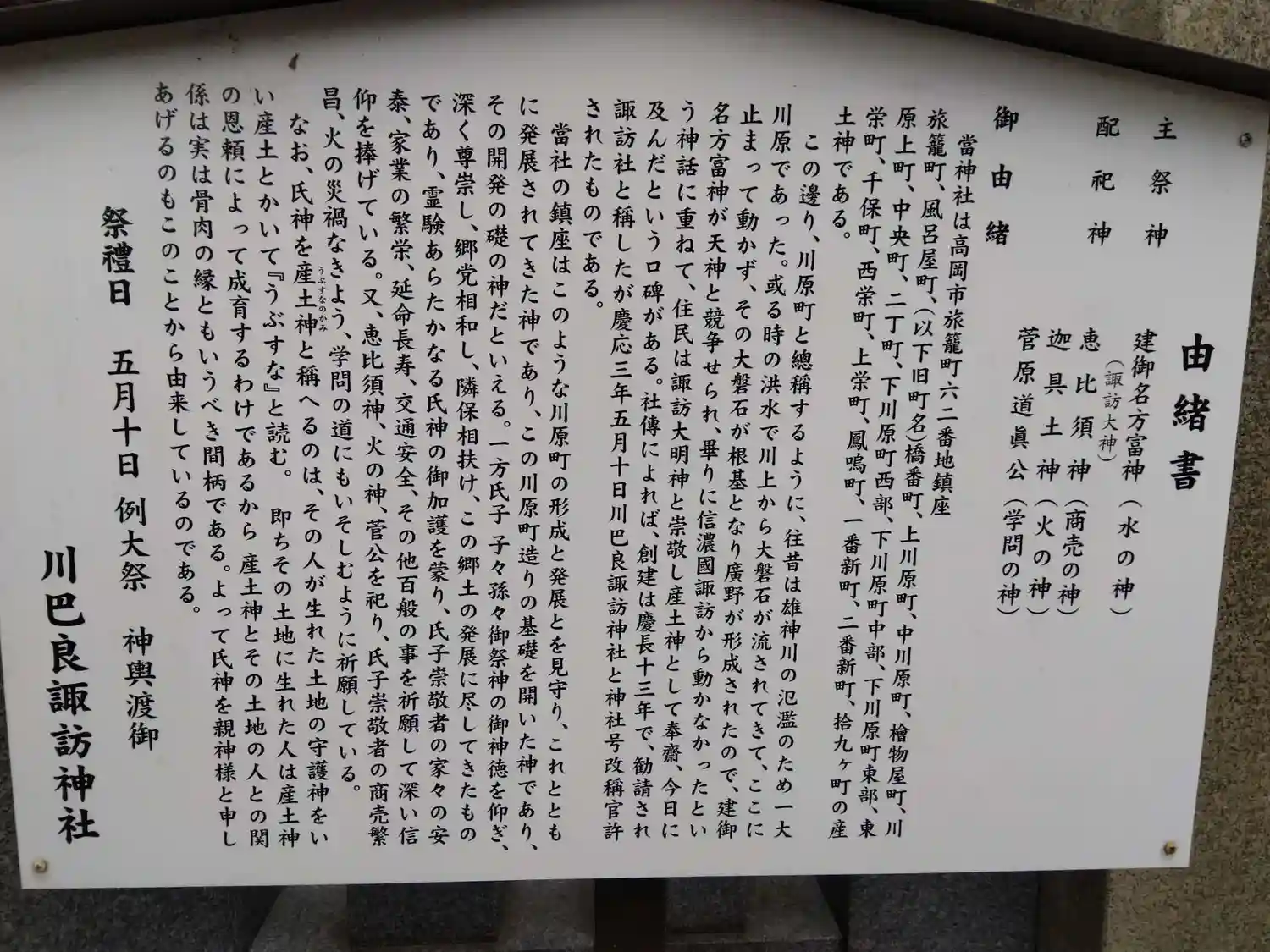 | ご祭神 | 建御名方富神、恵比須神、迦具土神、菅原道真公 |