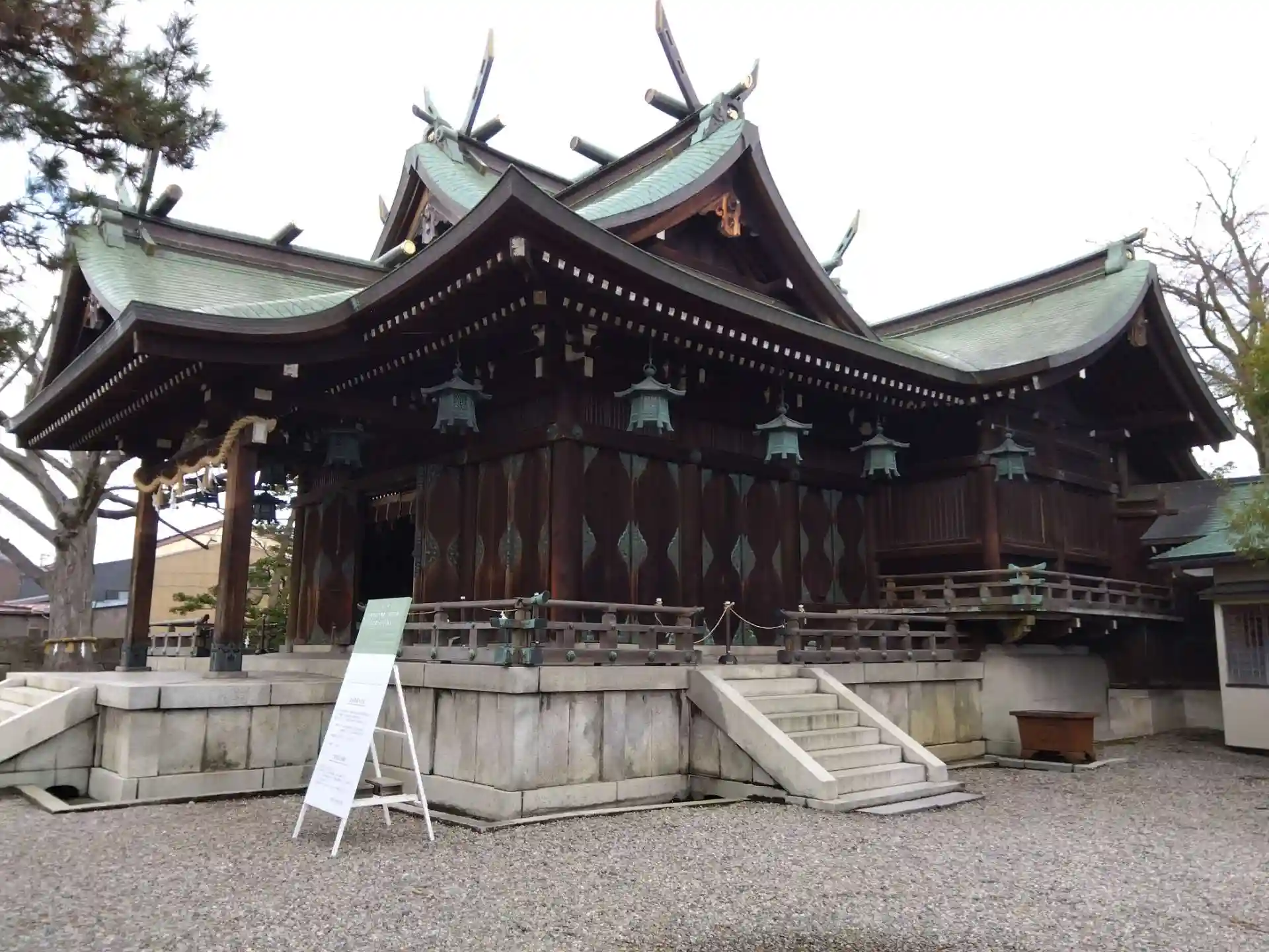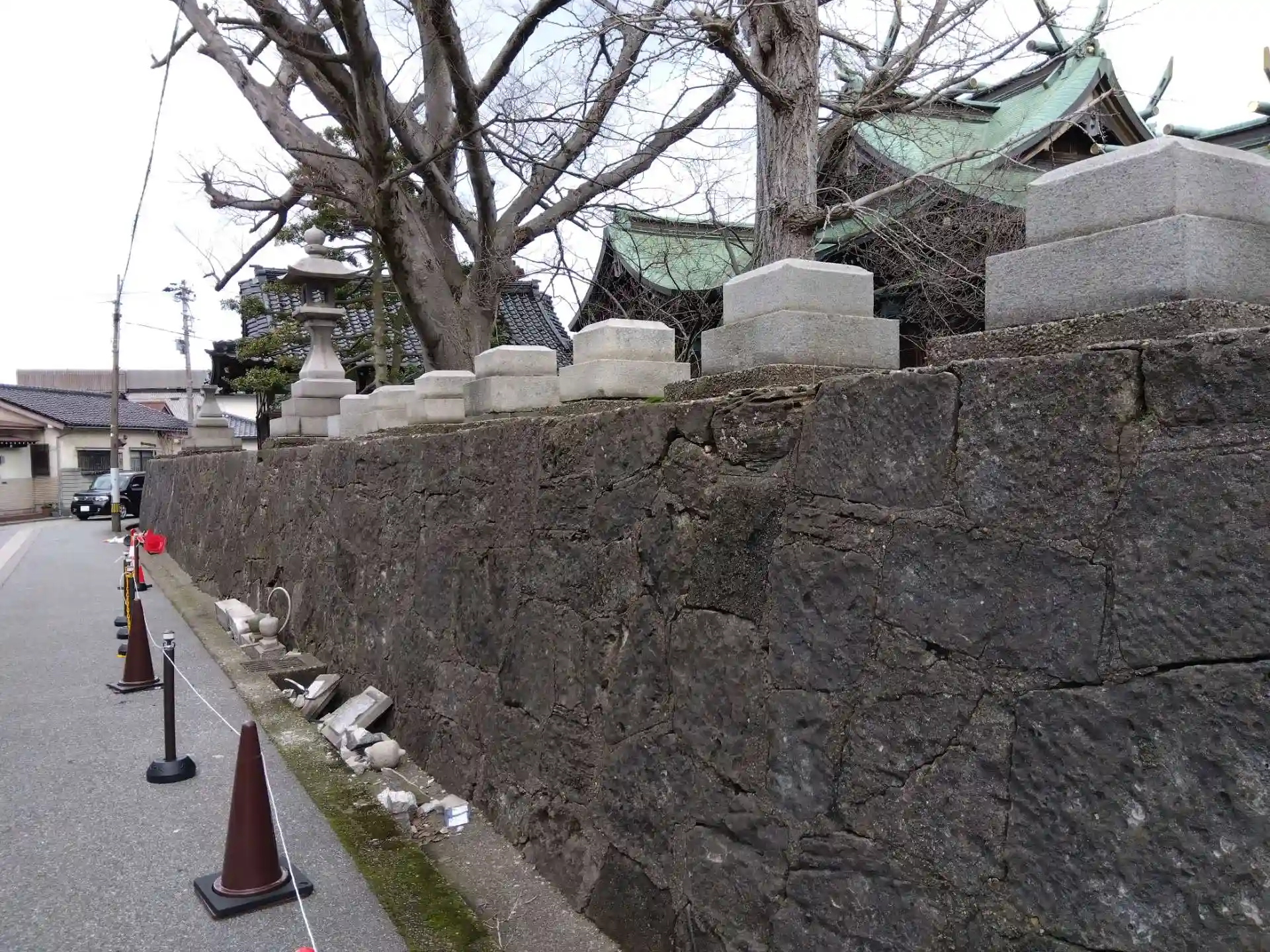 燈籠や玉垣の倒壊が多数見られ、正面鳥居からは入れません😵