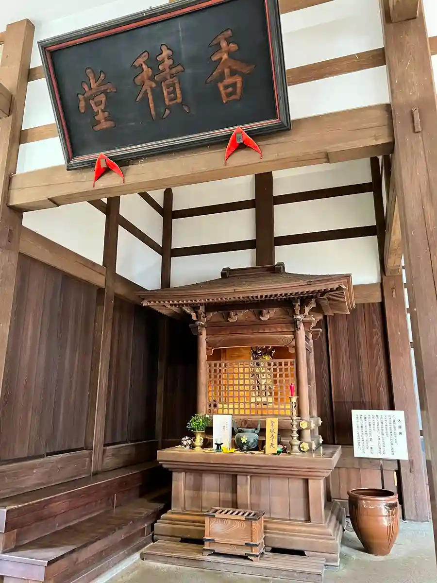 本尊の釈迦如来、普賢菩薩、文殊菩薩の釈迦三尊像のほか、達磨坐像、跋駄羅尊者像を安置。