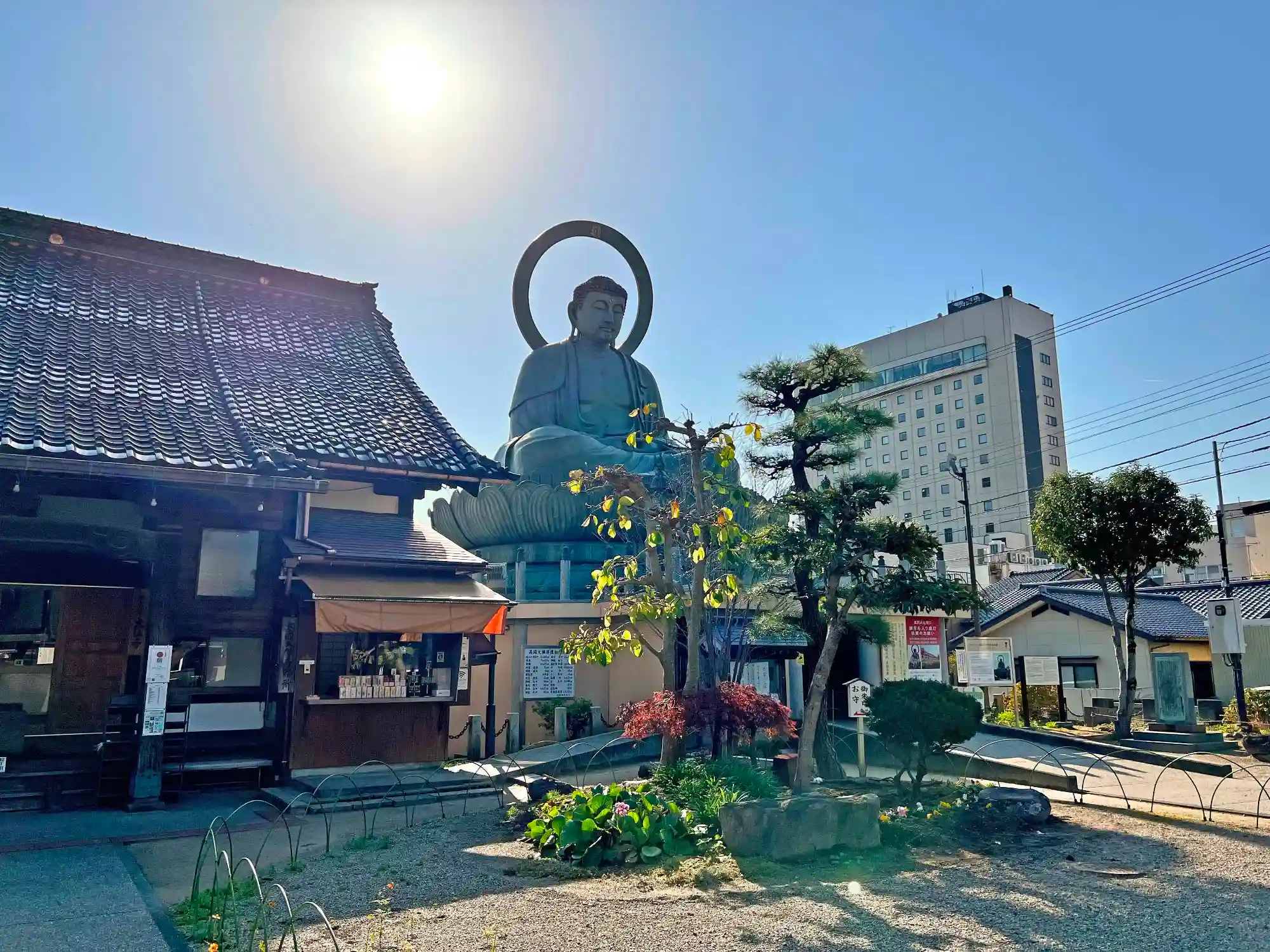 当寺は、JR氷見線・城端線・あいの風とやま鉄道・高岡駅の北方500mの平地の市街地にある。街の一区画の境内は縦に長いため参道はそこそこ距離があるが、横幅はなくコンパクト。境内北西端の入口を入ると、しばらくは街の公園のような雰囲気。境内南東端に本堂と高岡大仏博物館があり、博物館の上に高さ約16mの大仏が鎮座している。