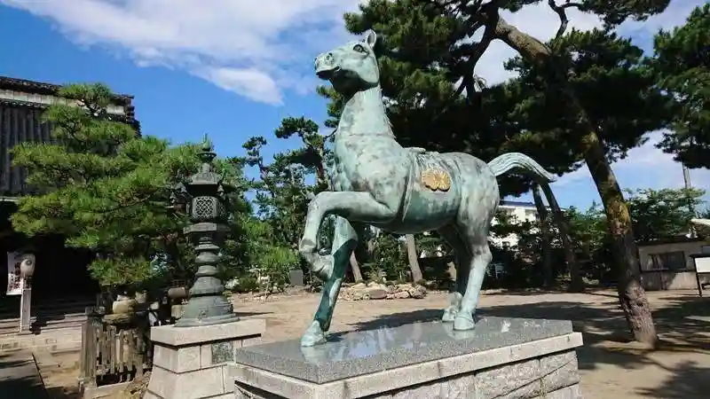 神馬像には、神紋である「五七桐」と「十六菊」の合わせ紋がある。(前田利家が使っていた)
