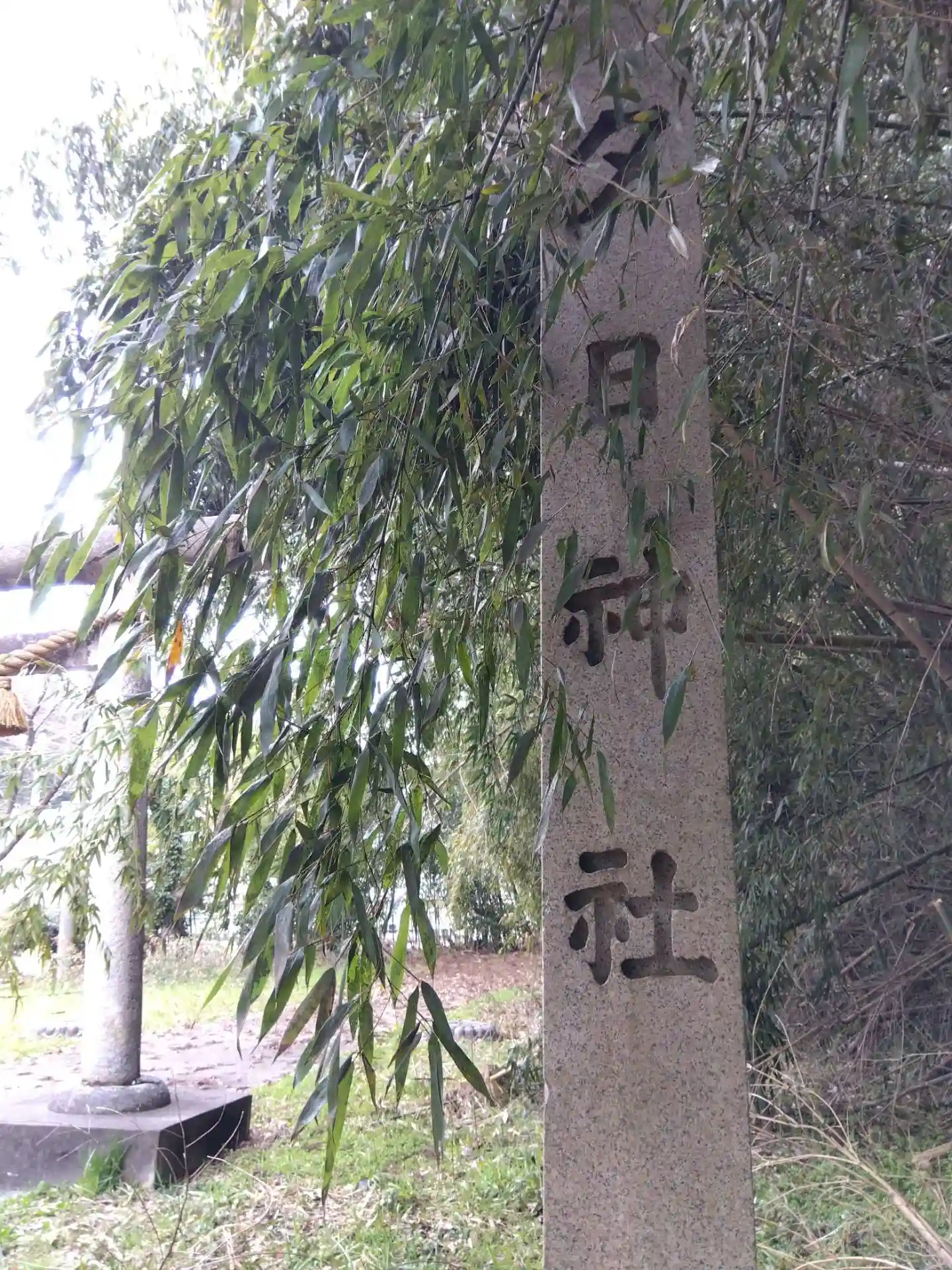 少し荒れた境内で、社号標には竹が被さる💦