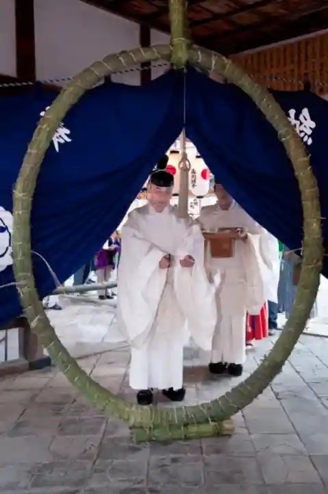 全国的には6月30日に行われることが多い茅の輪くぐりだが、当社では7月末に行っている。夏祭りの要素を併せ持ち、夜店や舞台での踊りなどが行われる。