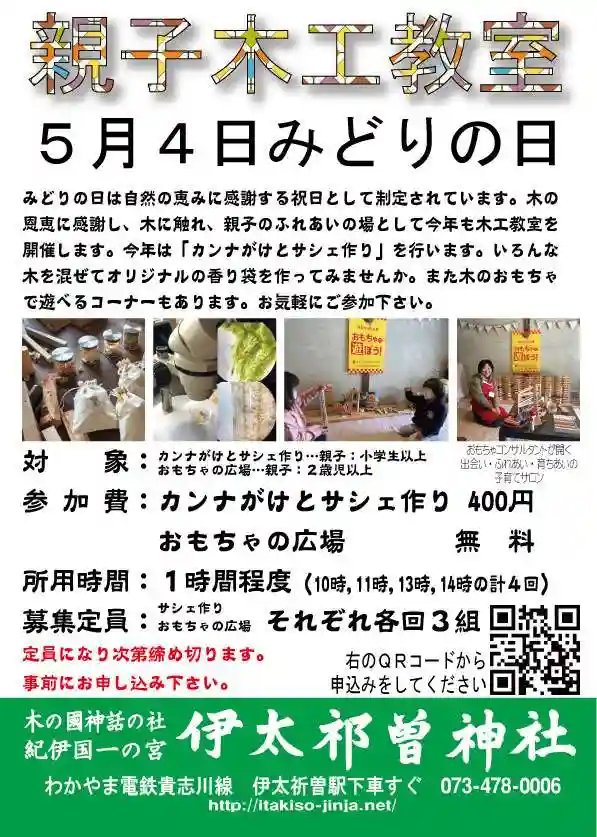 5月4日(水・祝)に親子木工教室を開催します。今年は①カンナ体験とサシェづくり、②木のおもちゃで遊…