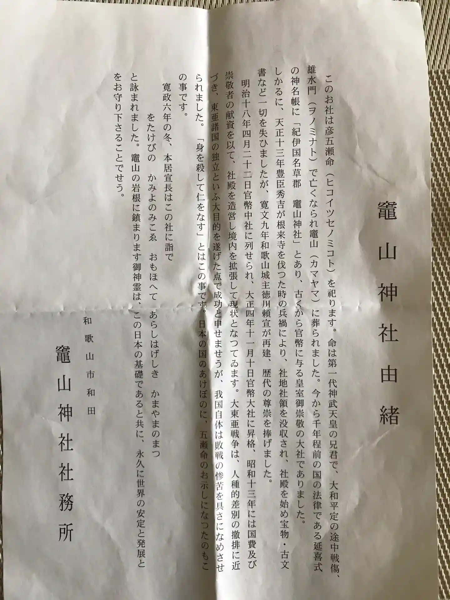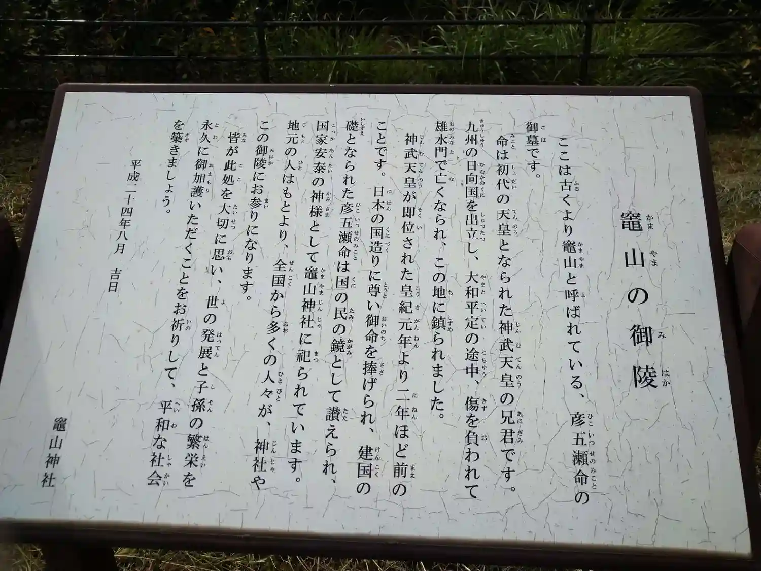 かまやま神社です。神武天皇の長兄の彦五瀬命(ヒコイツセノミコト)をお祀りされています。かまやまとは…