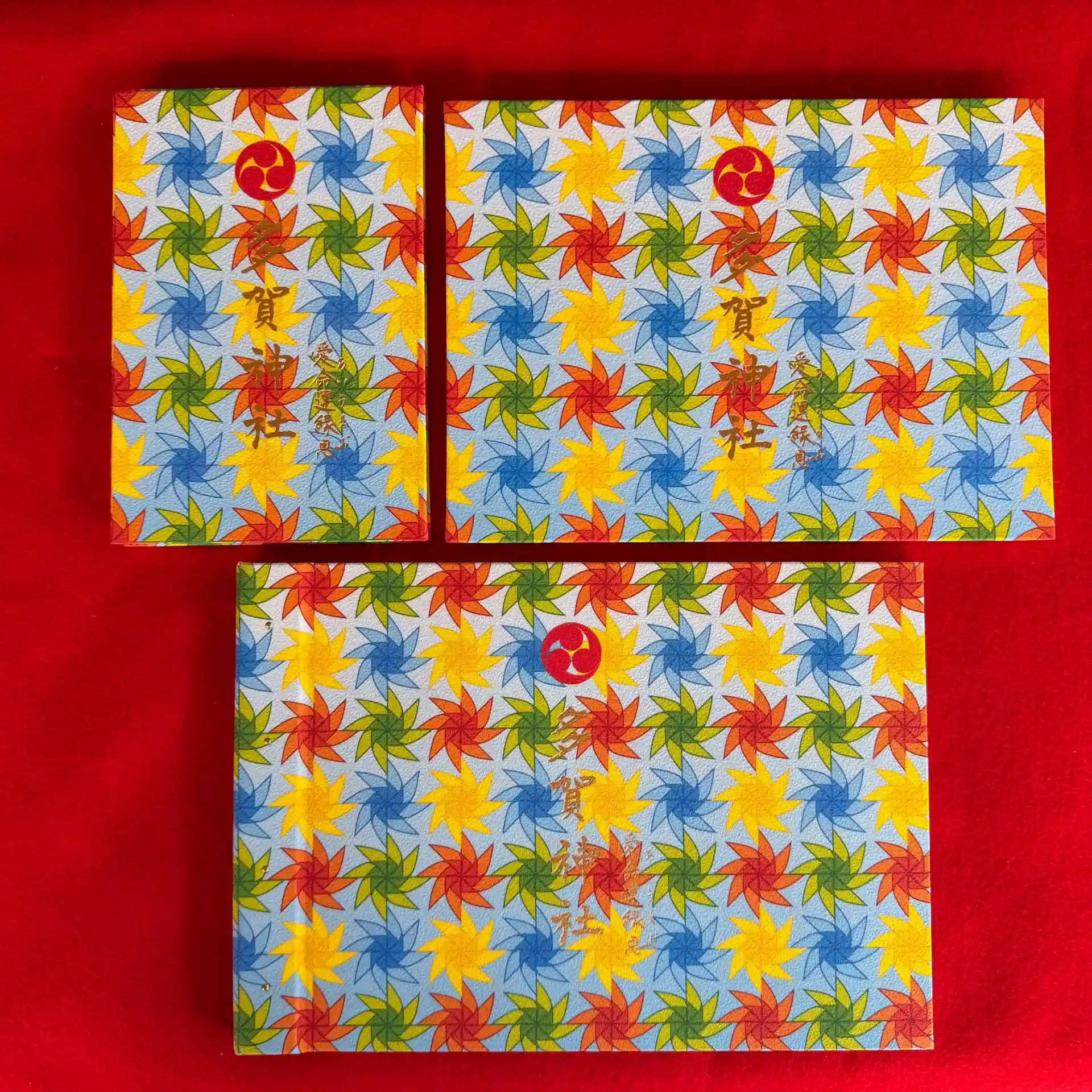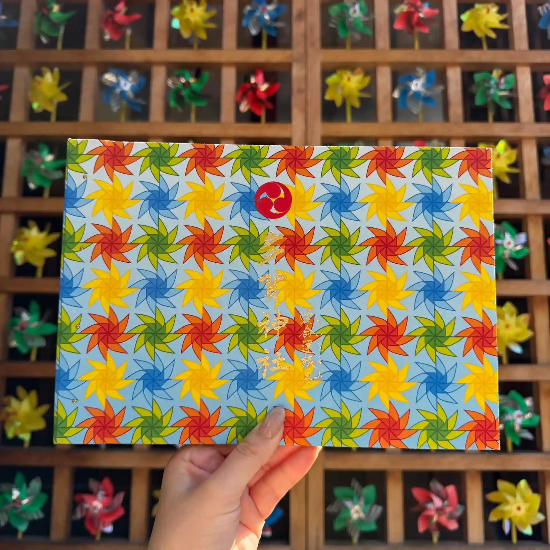 カラフルな風車が一面に広がる、華やかな御朱印帳です。