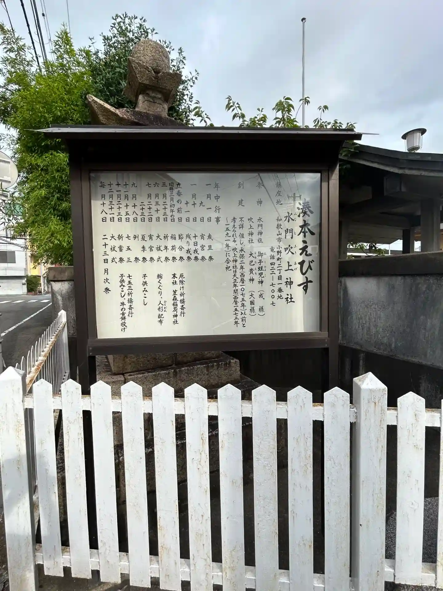 創祀 創祀は不詳。承保二年(一〇七五年)以前と考えられています。吹上神社は天正年間に合祀されています。その後、暫くは相殿でお祀りしていたが、後に社殿を分けて二神並べてお祀りしていたが戦災により社殿一切が消失したため戦後、同床共殿によりお祀りし、水門さん神社と称するになりました。水門神社は蛭兒神、吹上神社は大己貴神が御祭神で二柱の福の神をお祀りする全国でも例の少ない神社。現在の鎮座地は神武天皇東征のみぎり、御皇兄の彦五瀬命が長髄彦の流れ矢に当り、出血甚だしく崩御されたと言われる地である。