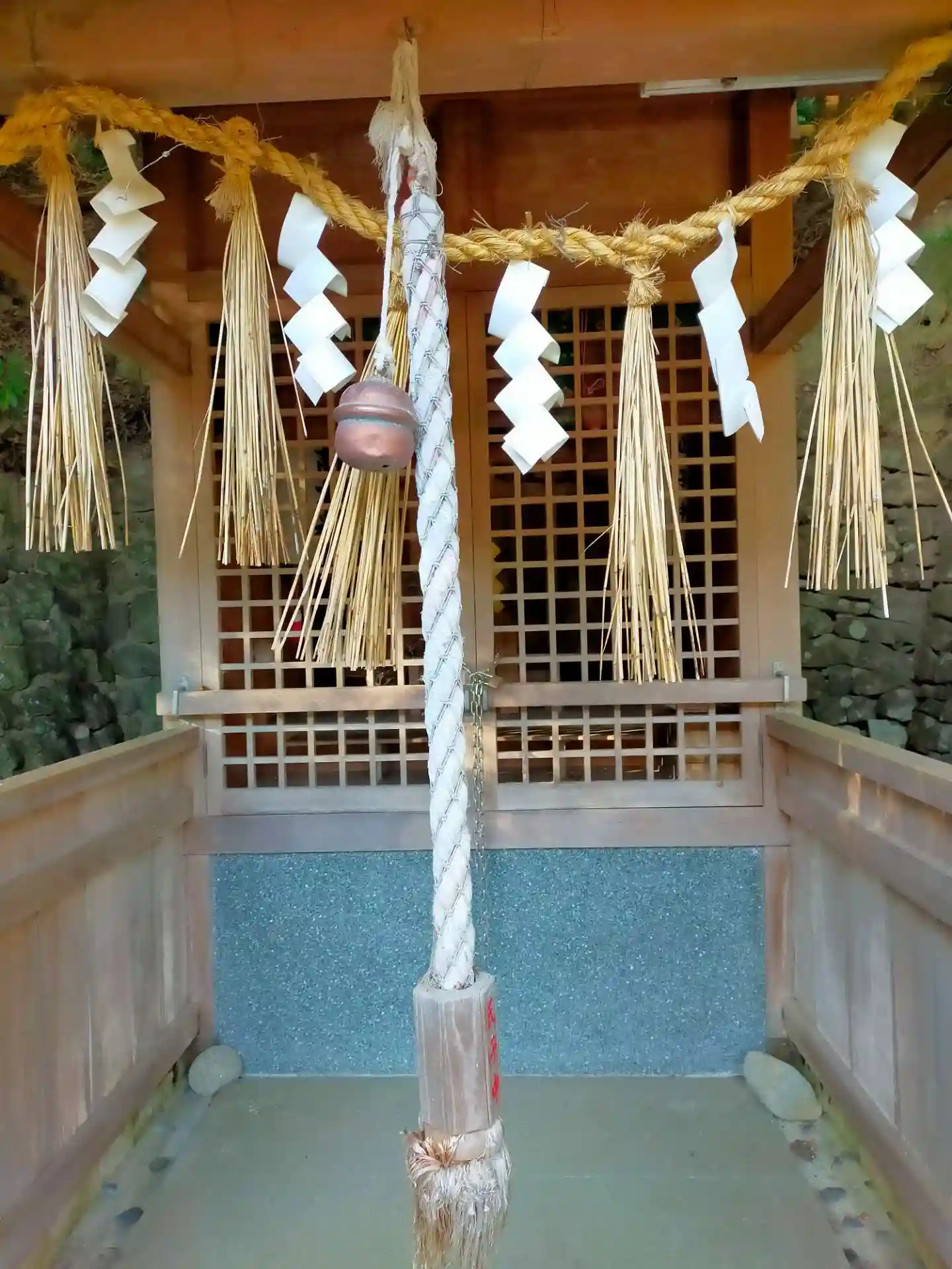 淡嶋神社から大阪方面へ。深山湾の所にあります。祭神は、大山咋大神です。日吉神社なので、拝礼所には、お猿さんも見えます。石壁は、小さなお城みたいですね。