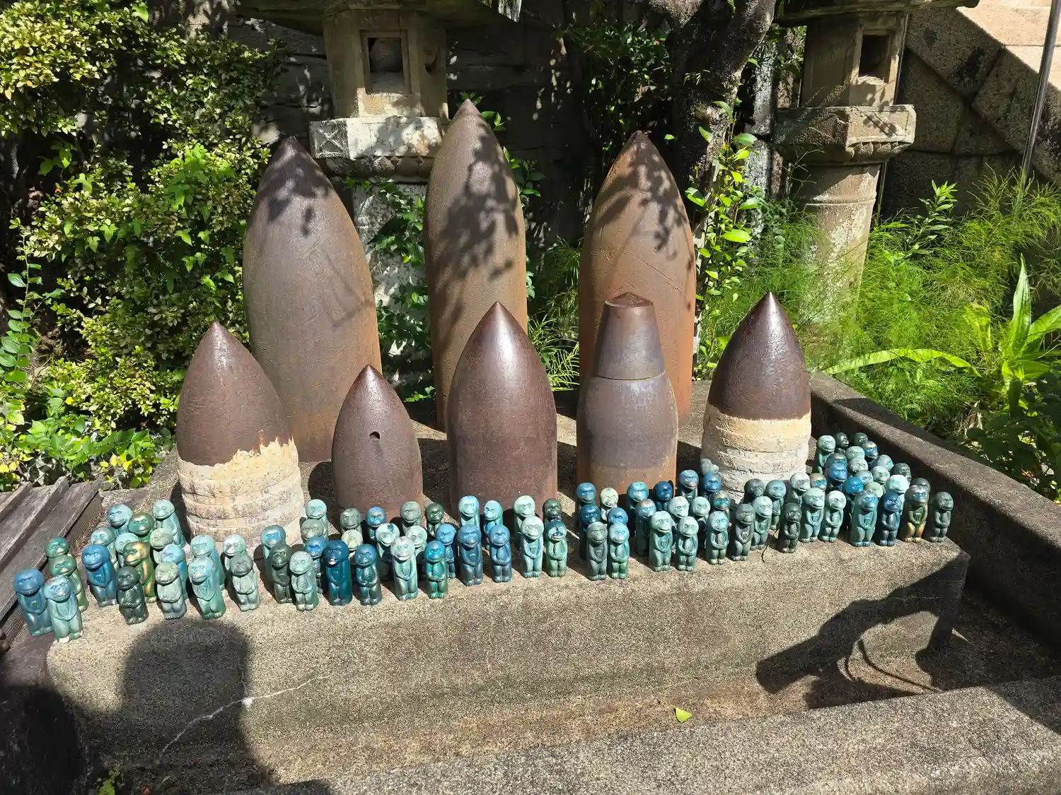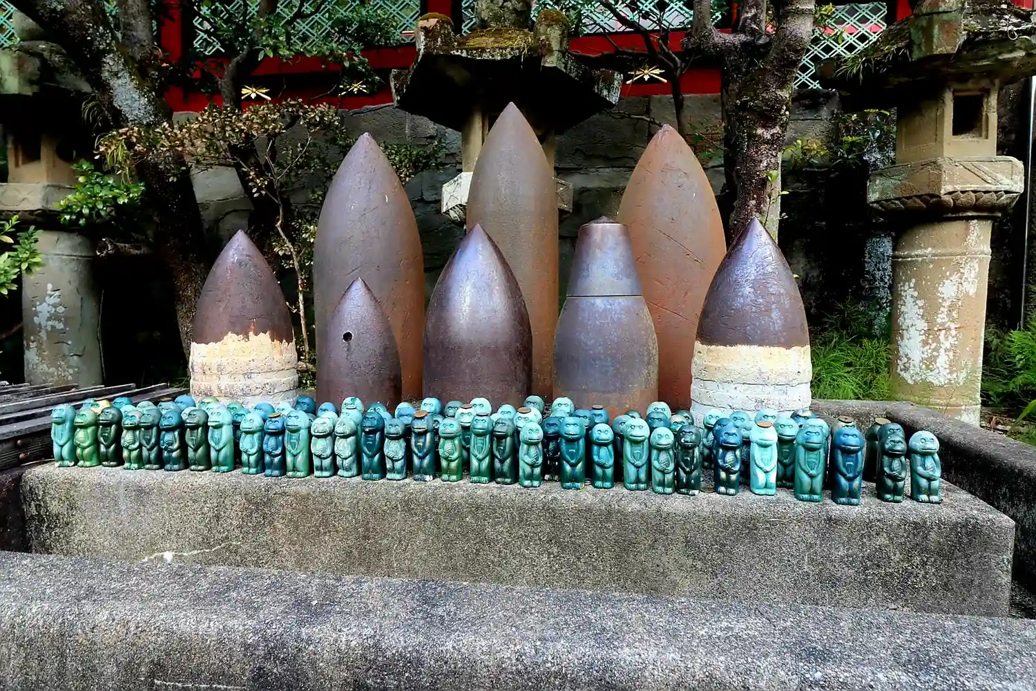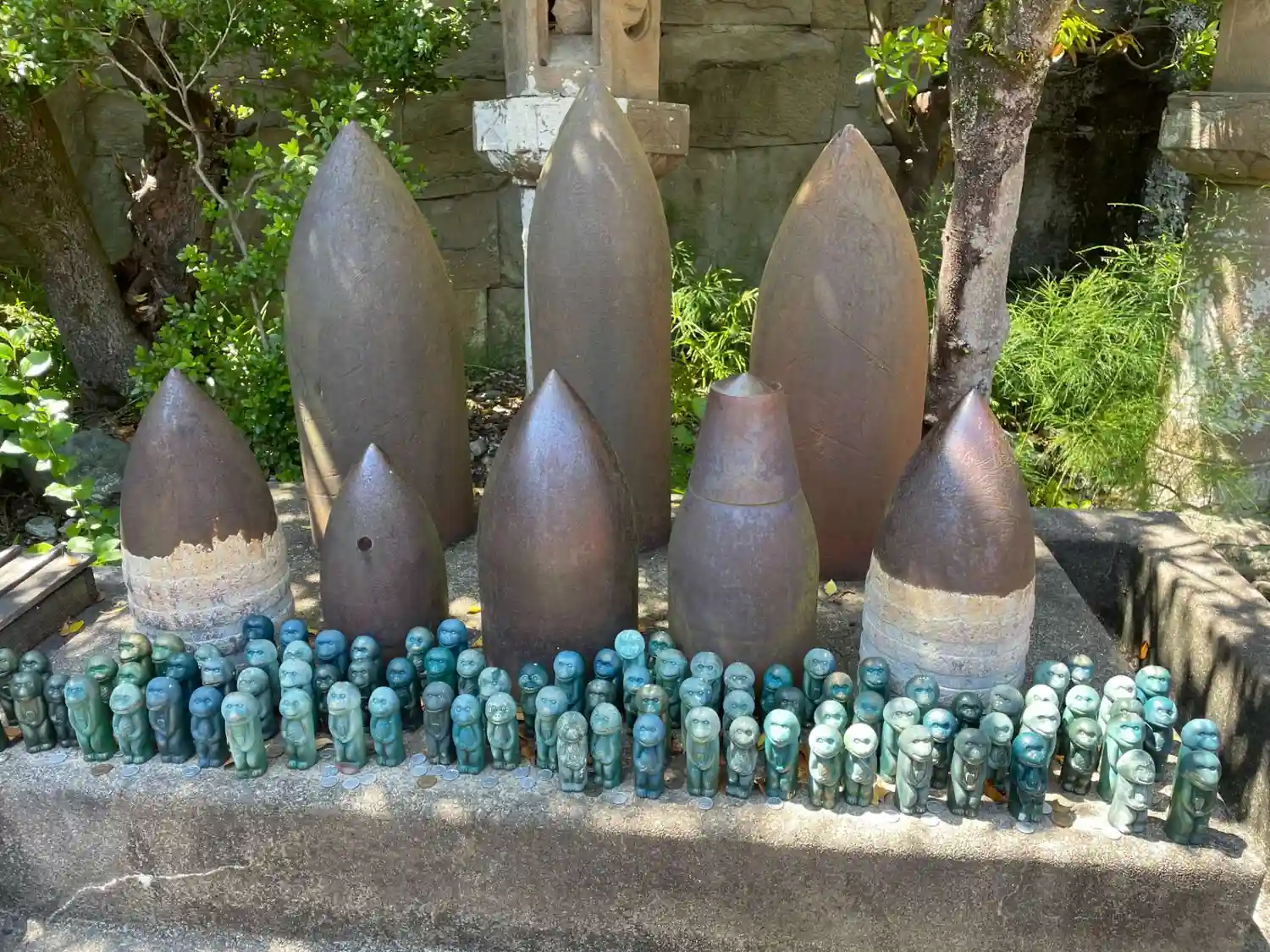 奉納された砲弾と「権現猿」の置物