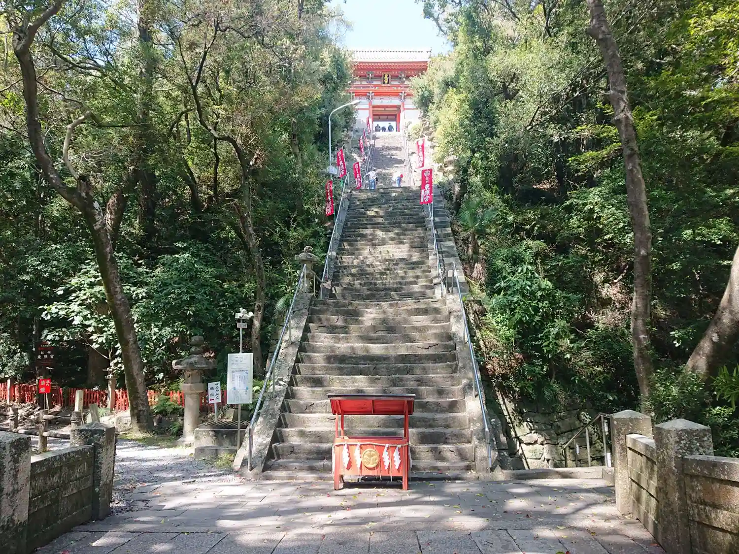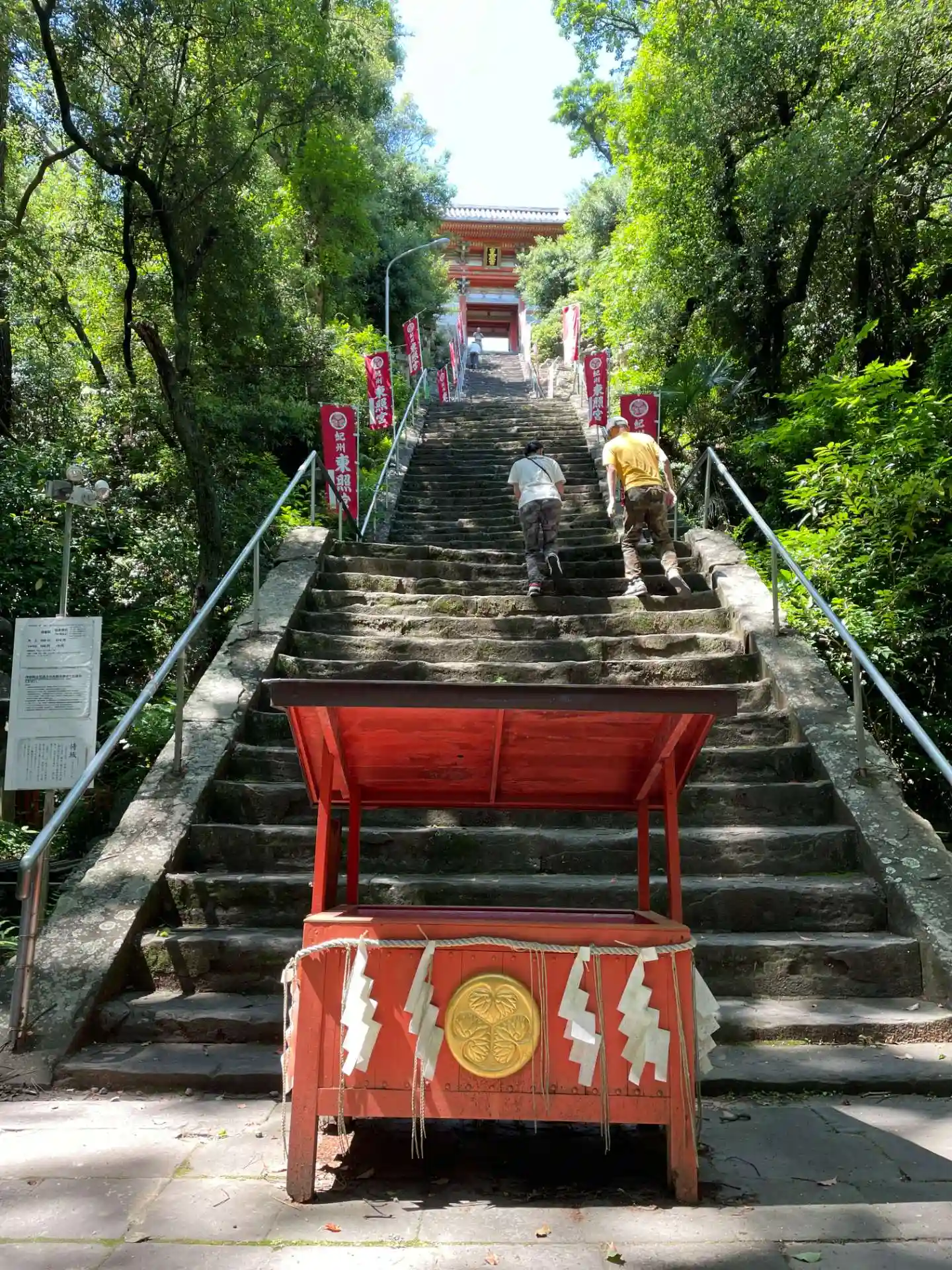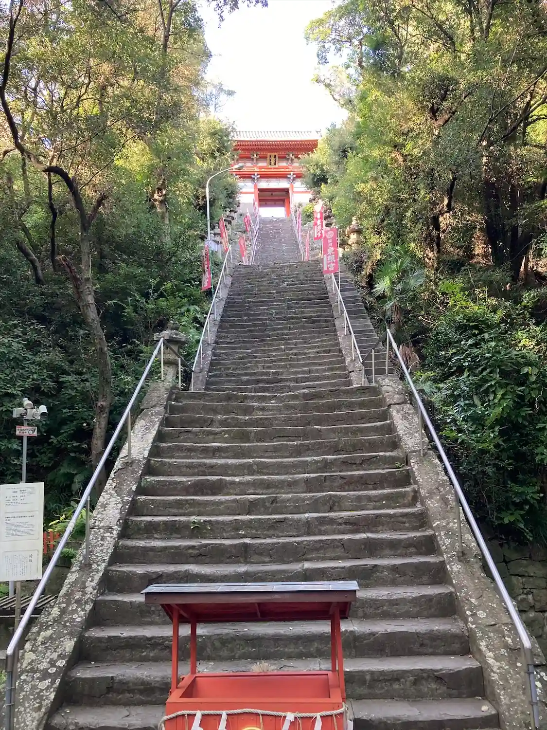 さて登りマス。結構な急階段です。108段あるので、1段ずつ煩悩を踏みしめましょう😏下でも遥拝できるようにお賽銭箱が用意されてますね🙏