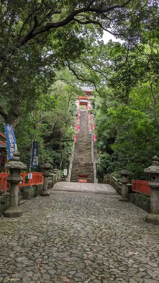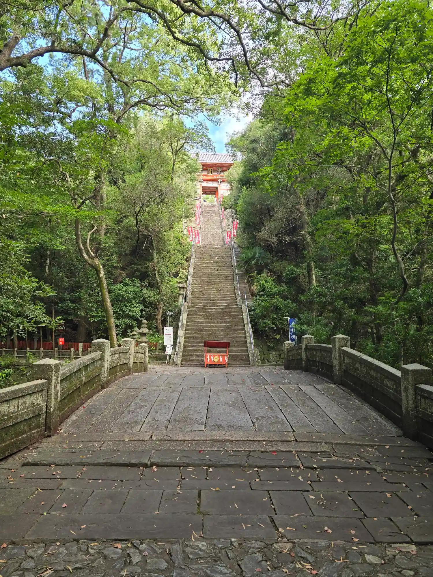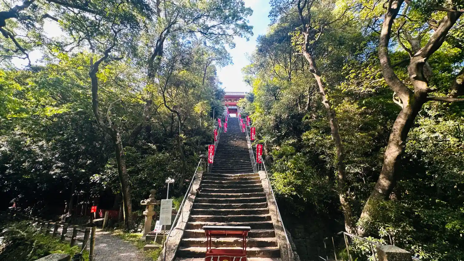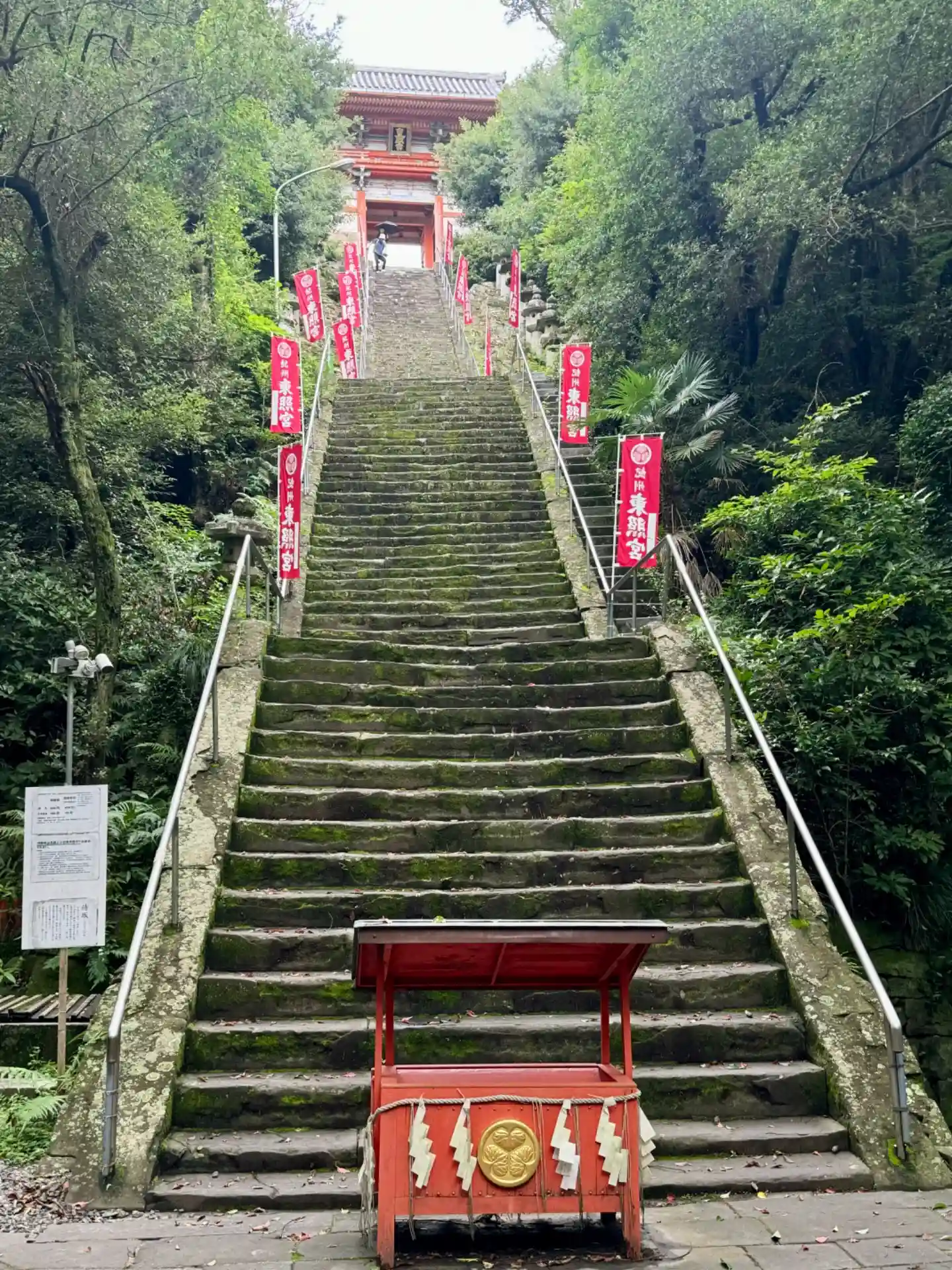 さて登りマス。結構な急階段です。108段あるので、1段ずつ煩悩を踏みしめましょう😏下でも遥拝できるようにお賽銭箱が用意されてますね🙏